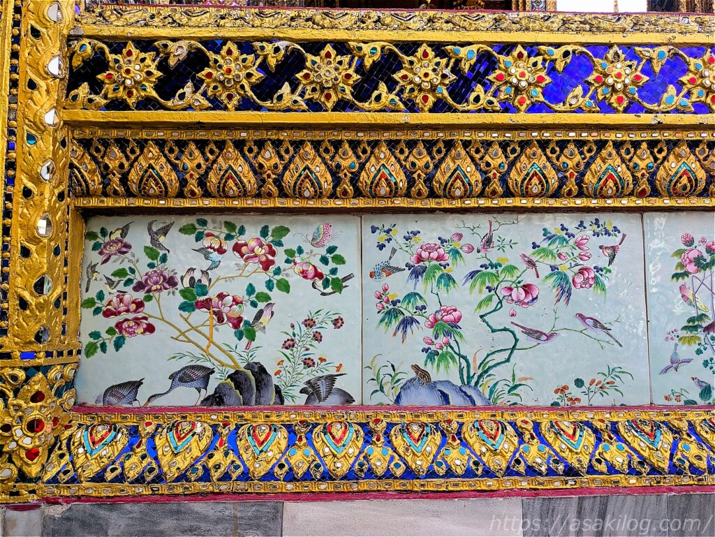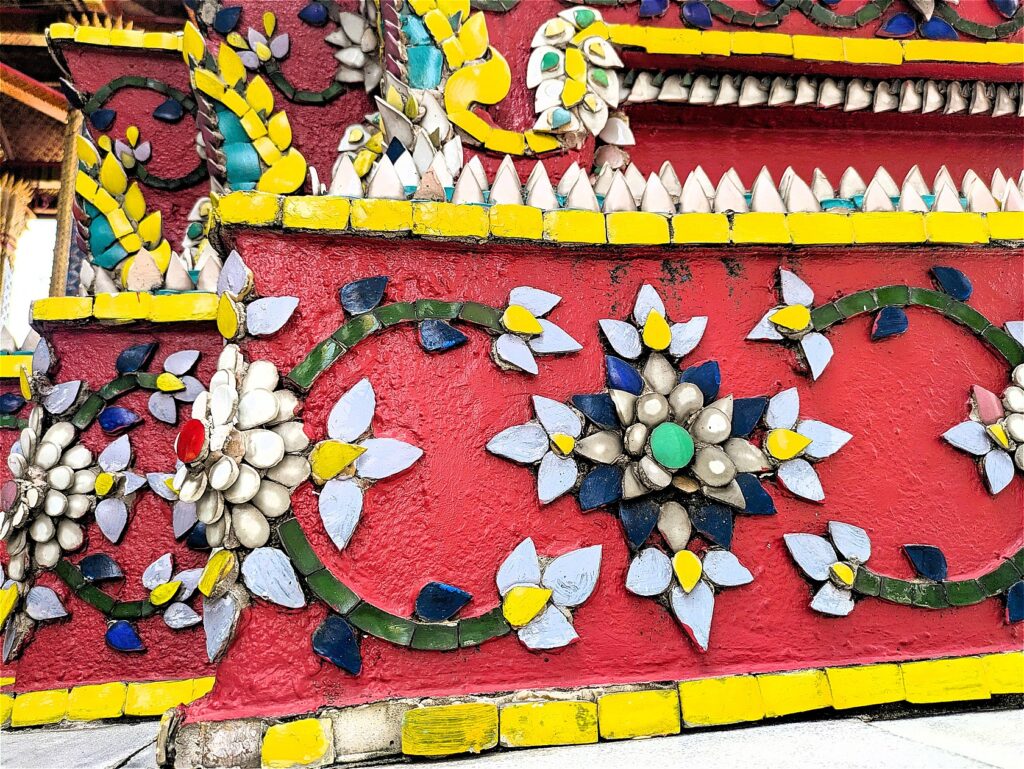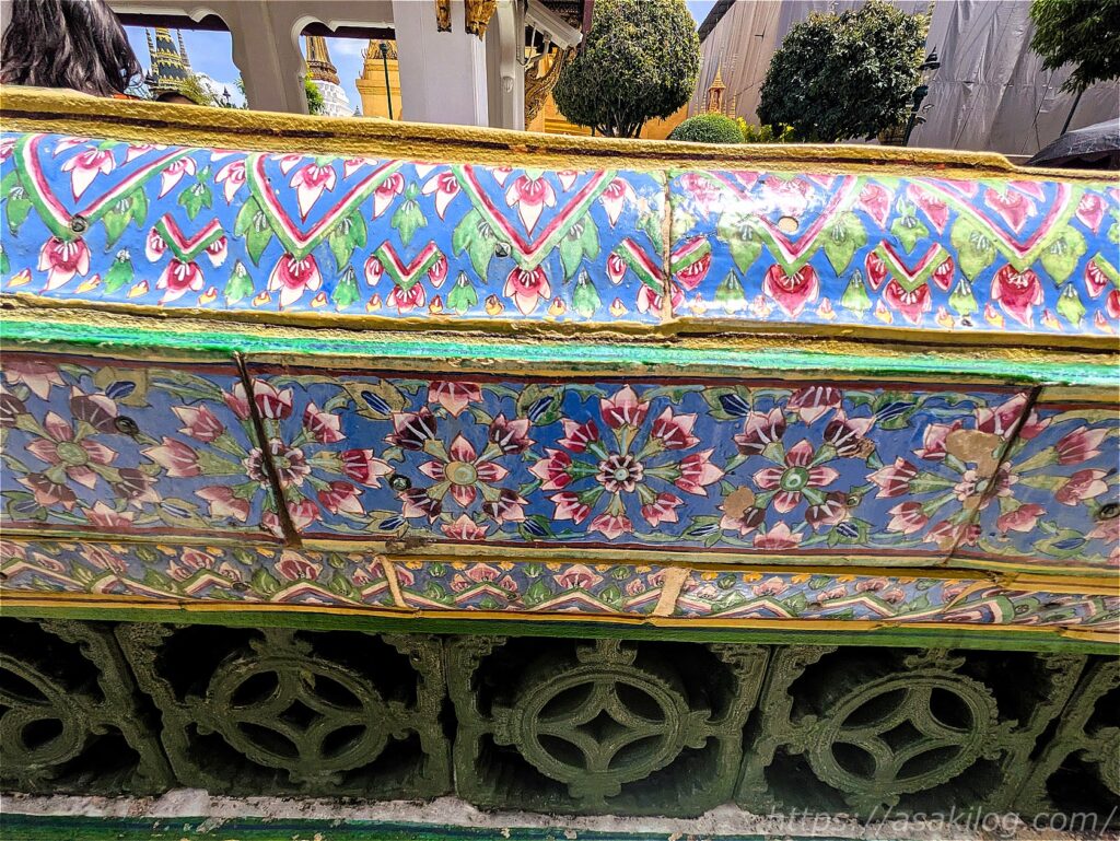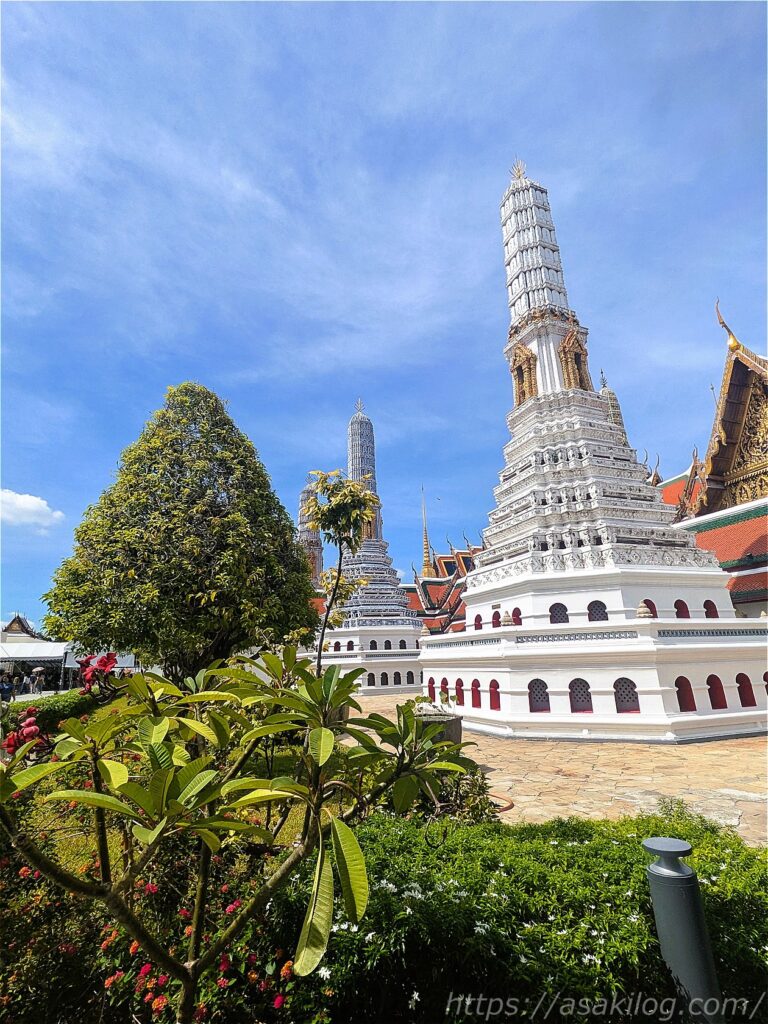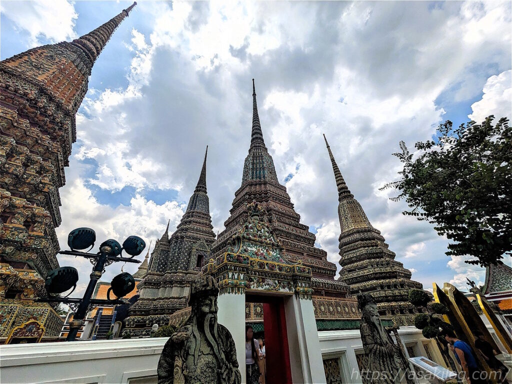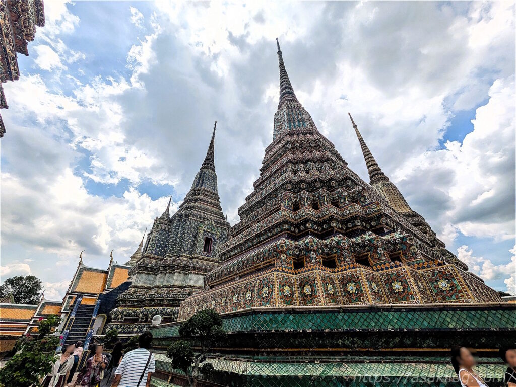 全体を細やかな装飾で覆われた大仏塔は4基あり、ラーマ1世から4世に至るまでの歴代4国王を表していて、中にはそれぞれの王の遺骨が納められています(緑がラーマ1世、白が2世、黄色が3世、青が4世)。