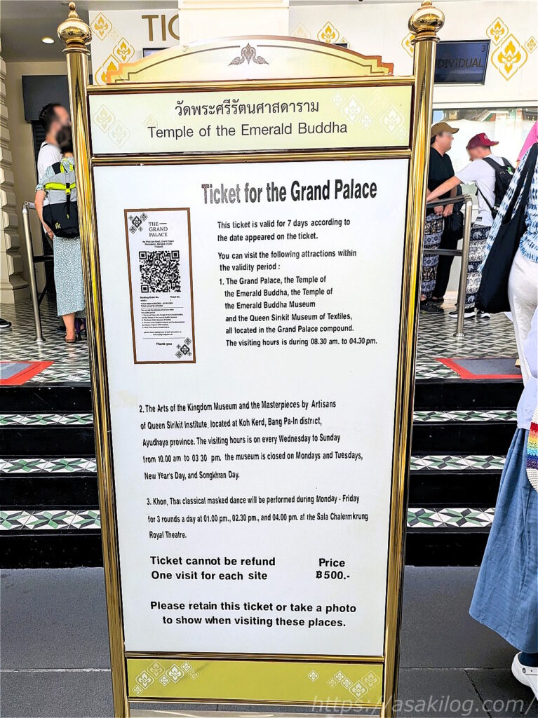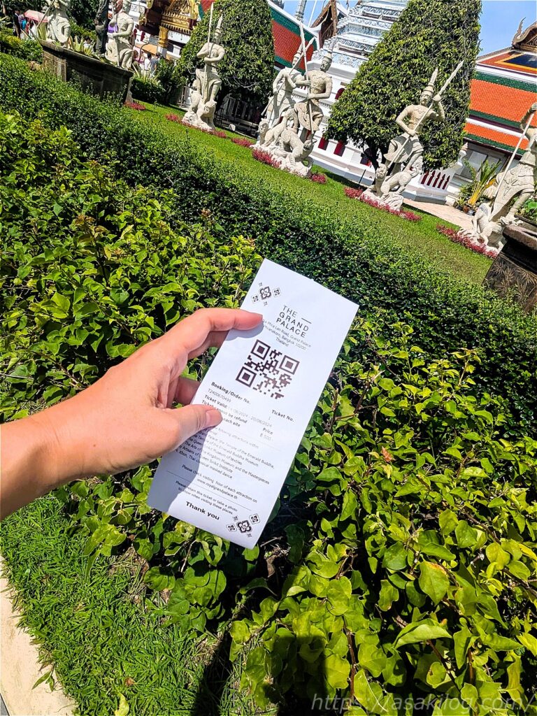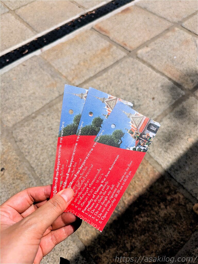 案内によると7日間有効期限で王宮敷地内の博物館?などにも入れるようですが、そんなに時間の余裕も無いし、この後続けて散策するワット・ポーは1人300THB・ワット・アルンは1人200THBだったため、なおさら高額に感じました。