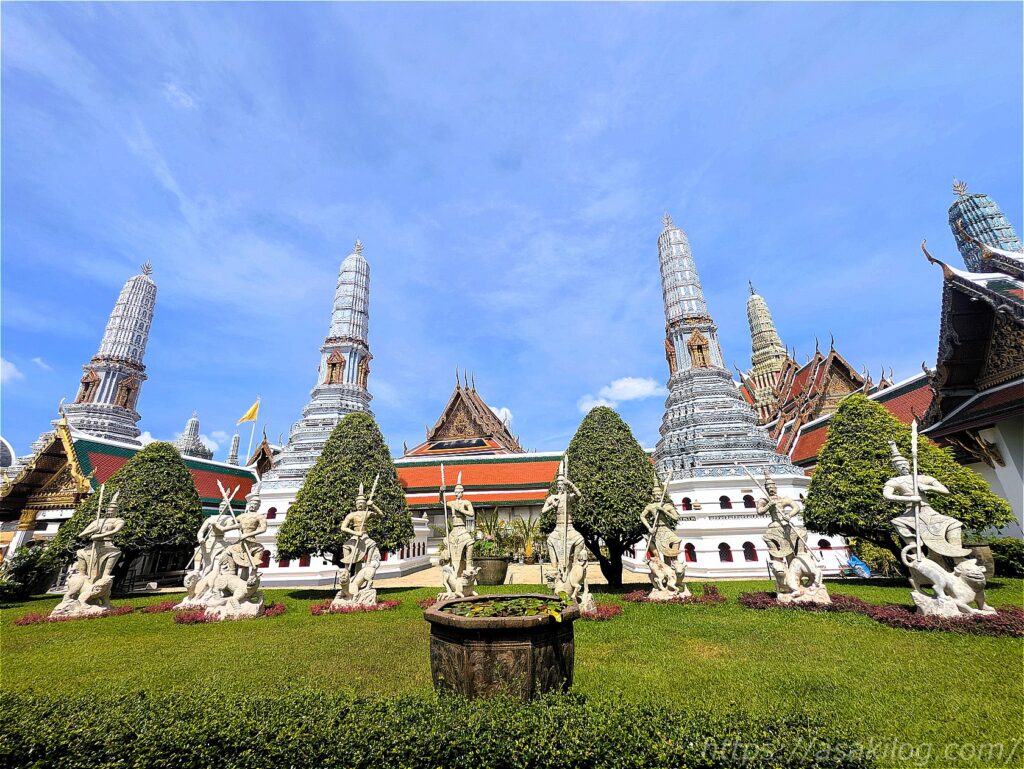 ワット・プラケオ内には、8基の仏塔も立っています。1枚目の写真はチケット売り場から見えた仏塔、2枚目の写真は中で撮影した仏塔です。外見は同じですがそれぞれ仏教的な意味が込められていて、タイル張りで装飾した仏塔の色で区別されているそう。