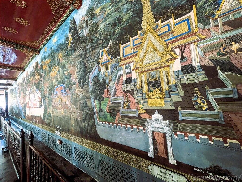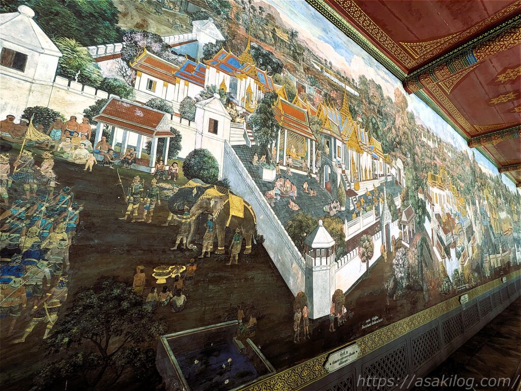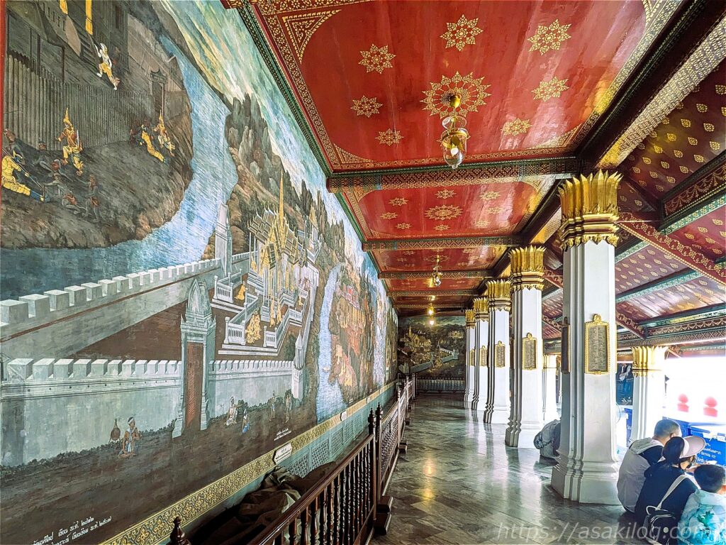 回廊の内壁には、インドの叙述詩「ラーマーヤナ」をタイ風に翻案した「ラーマキエン」の物語が描かれているそう。