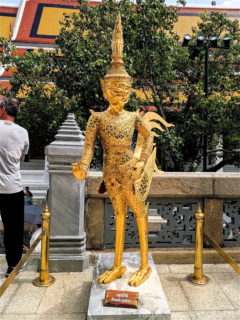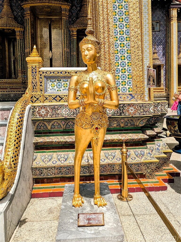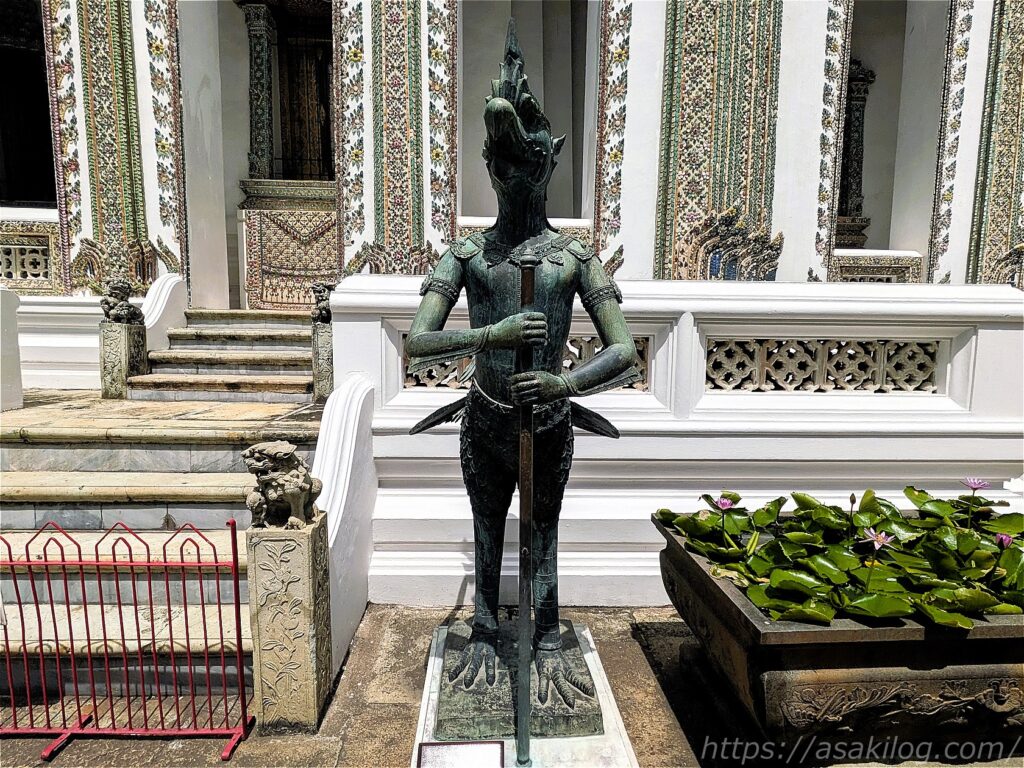 金の像も立っていて、タイの神話に登場する犯人半獣の姿なんだとか? 1枚目の写真が「Ap Sara si」、2枚目の写真が「Asura paksi」。