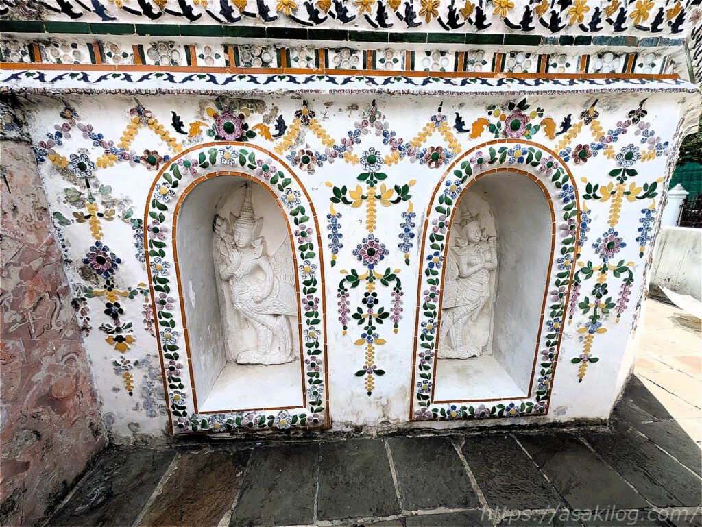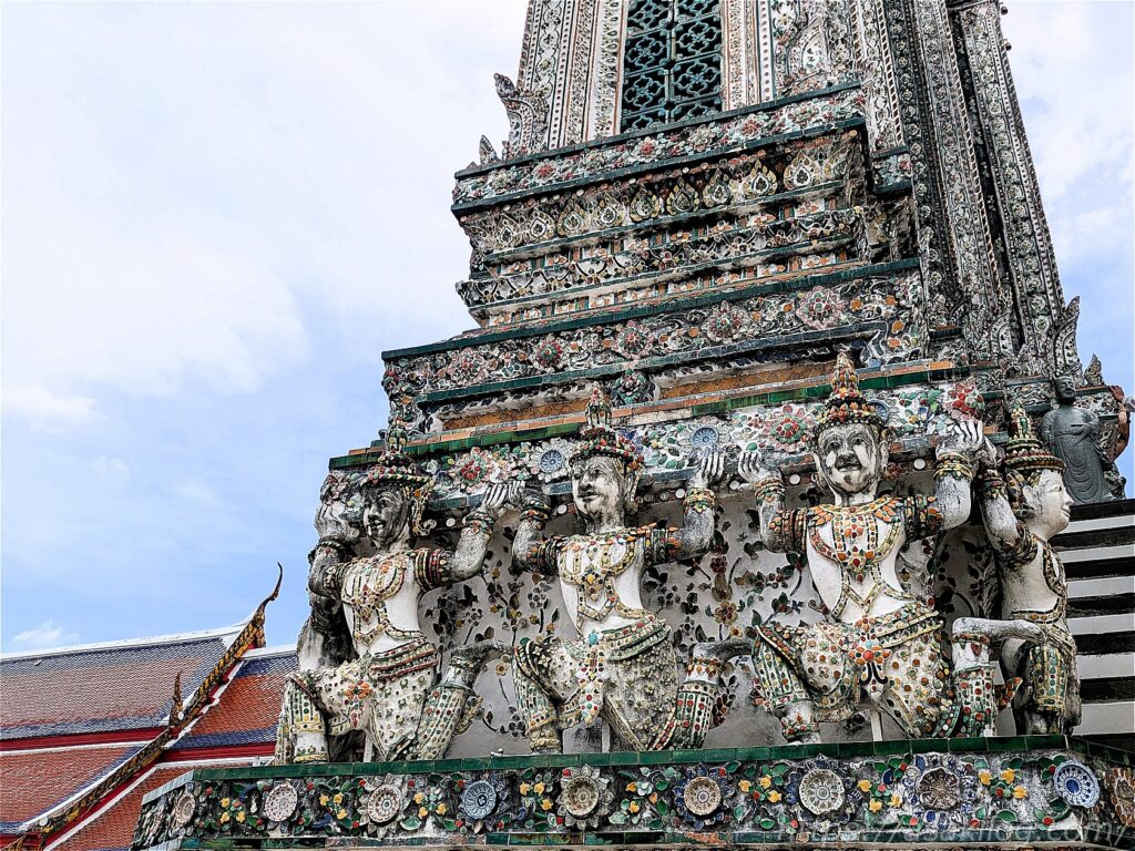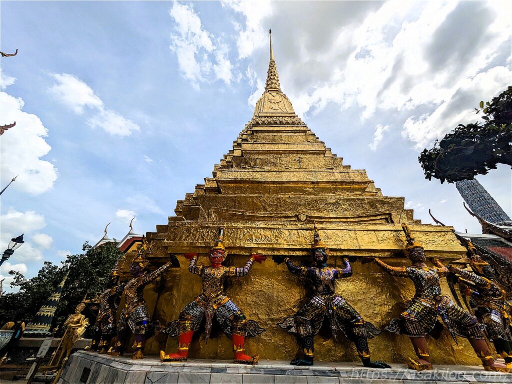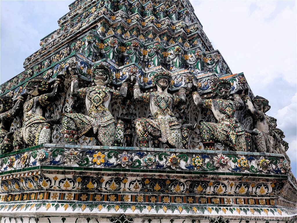 よくよく目を凝らしてみると、仏塔はいろいろな神様に支えられています。3枚目はタイの精霊ギンナリーとギンノーン?(Googleレンズ調べ)
