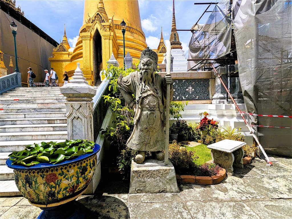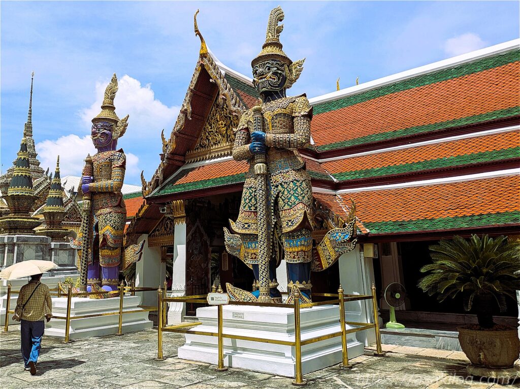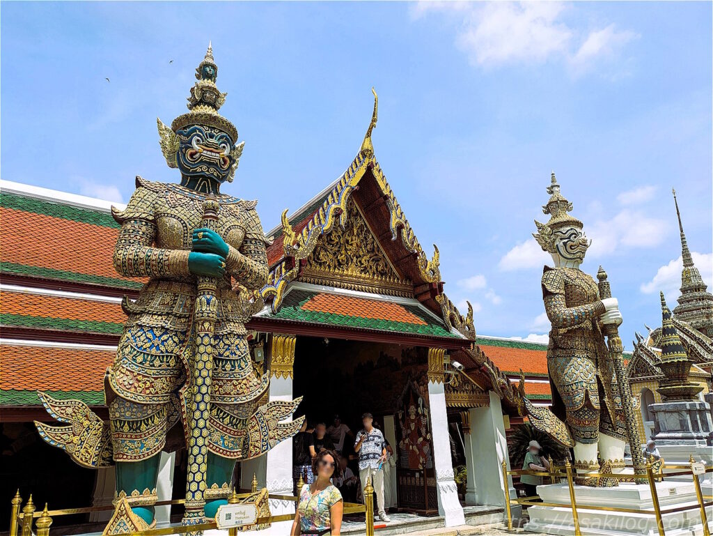 ワット・プラケオの回廊途中6か所の出入口には、大きな武器を携えた魔除けの鬼(ヤック)が立てられています。これらはラーマ3世時代に造られ、寺院全体を守護する魔除けの役目を果たしているそう。