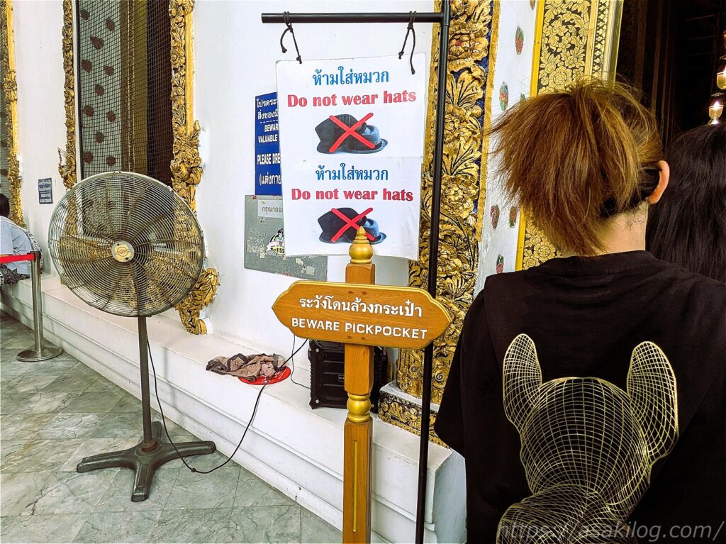 こちらが寝釈迦仏が安置されているお堂の入口。列に並んで、入口で靴を脱ぎ用意されているビニール袋に入れましょう。帽子も脱いでから中に入ります。