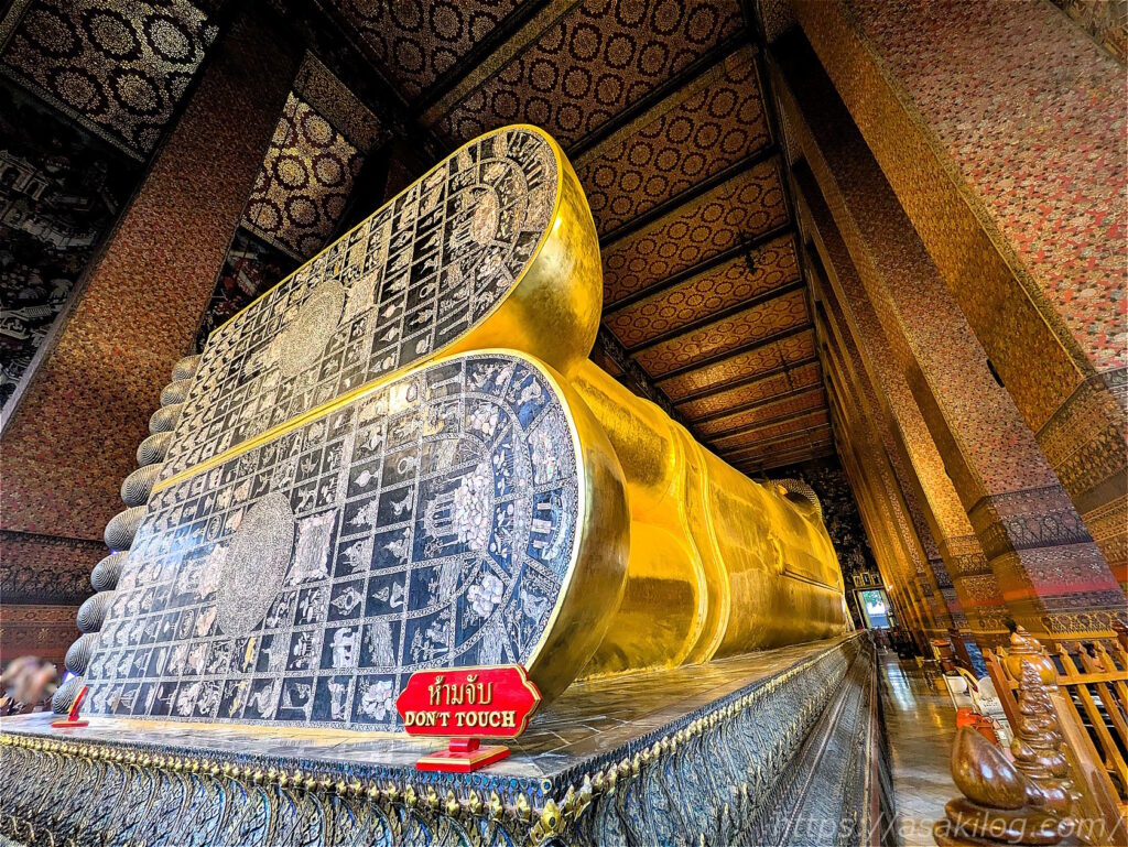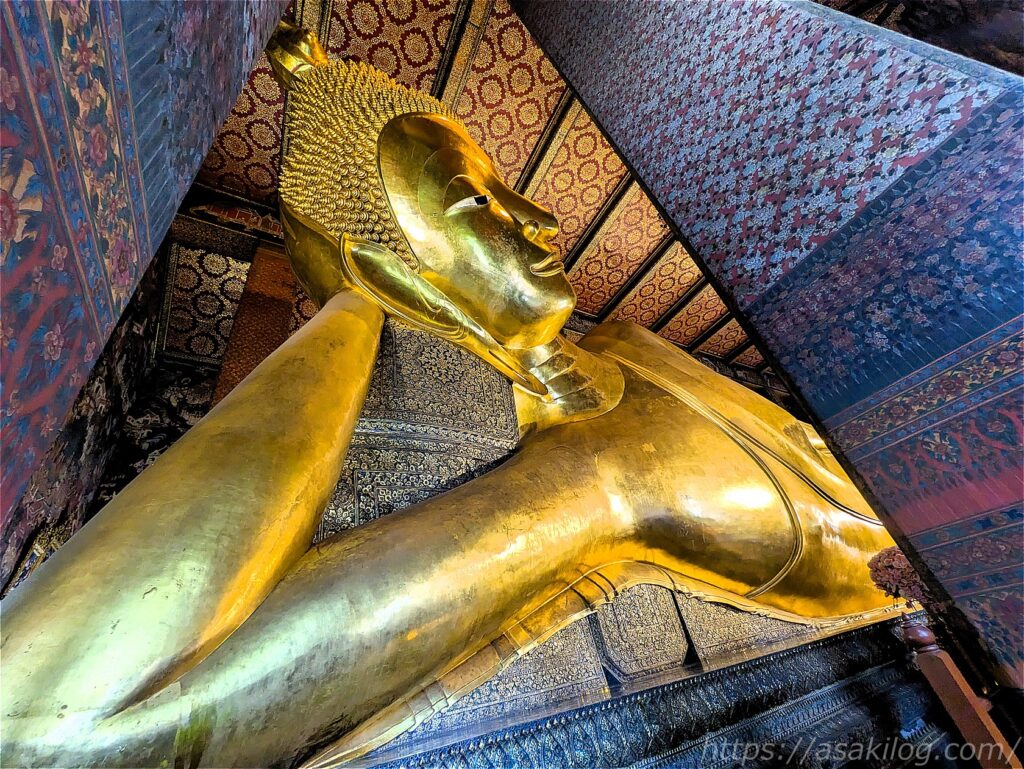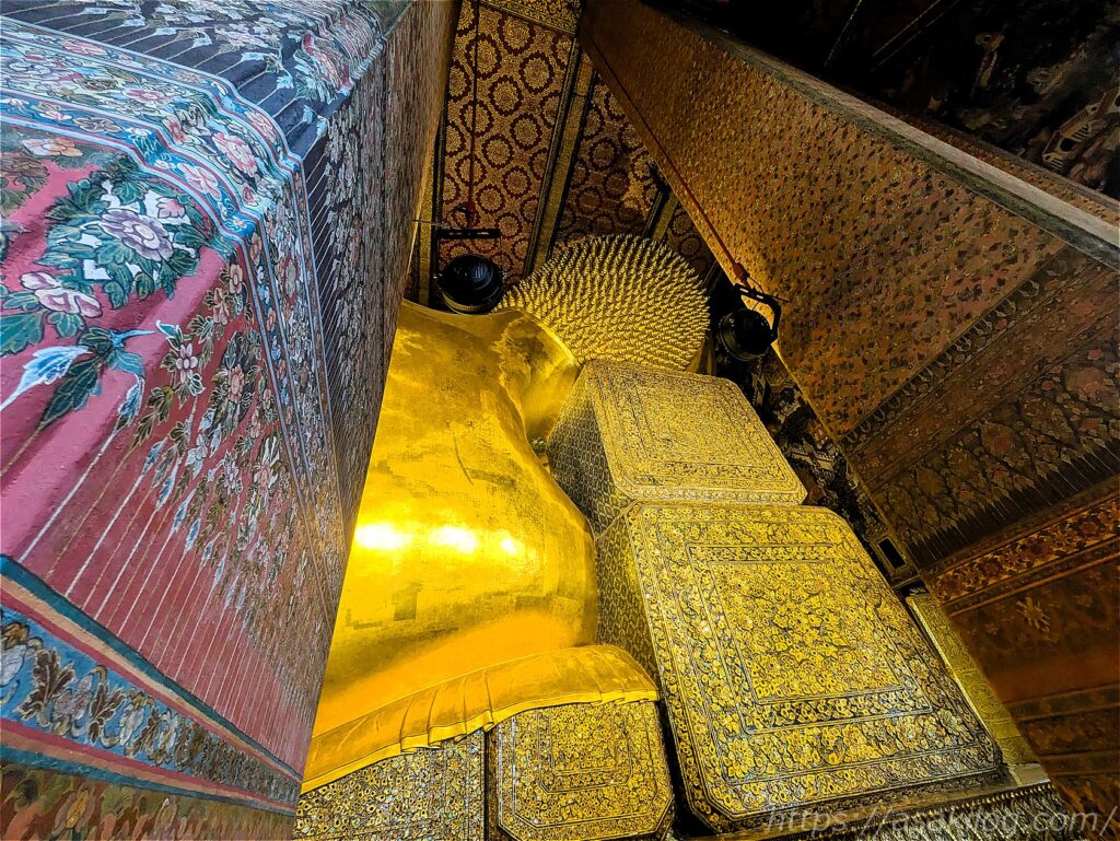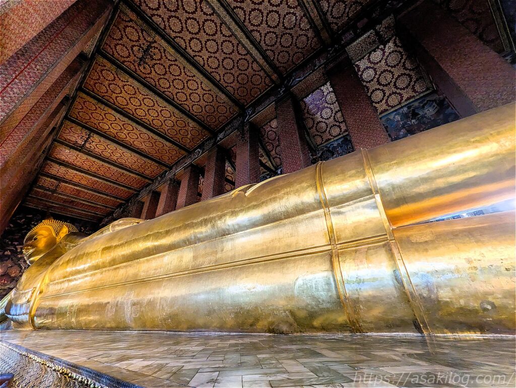 巨大な寝釈迦仏の足先の方まで移動して撮影すると、何とかギリギリ全体図が入りました。