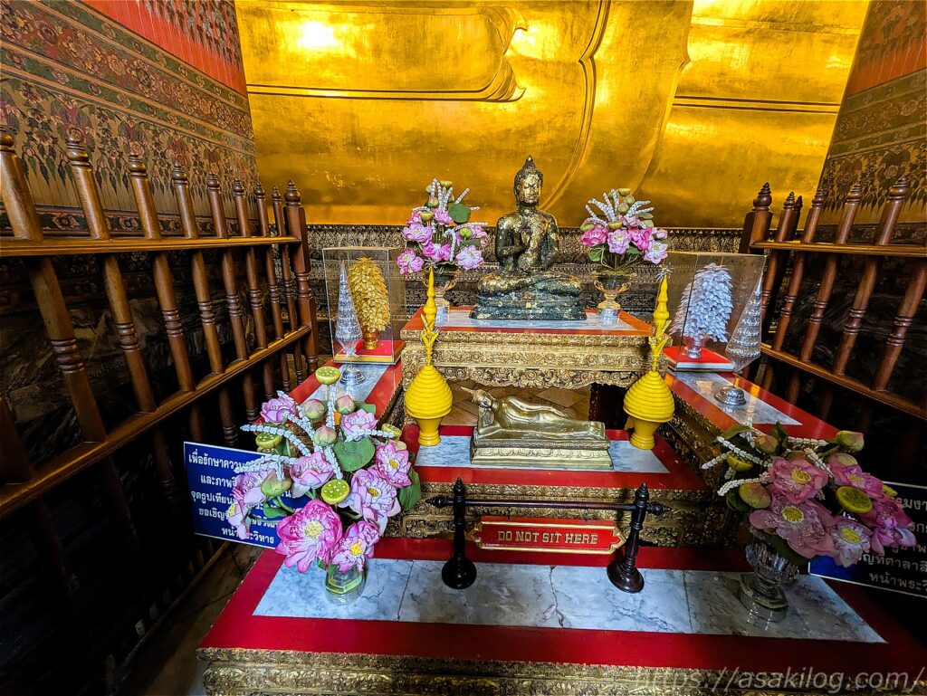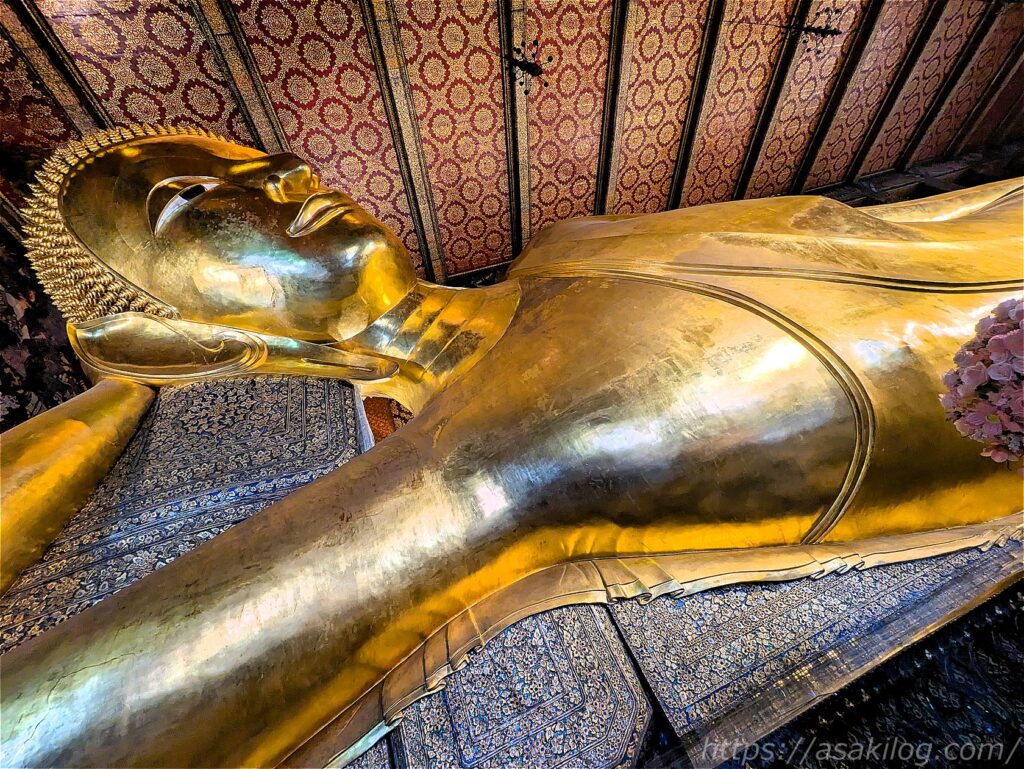 そして最後に寝釈迦仏のキラッキラの背中や優雅な後ろ姿も。頭を乗せている枕にも美しい装飾が施されていました。