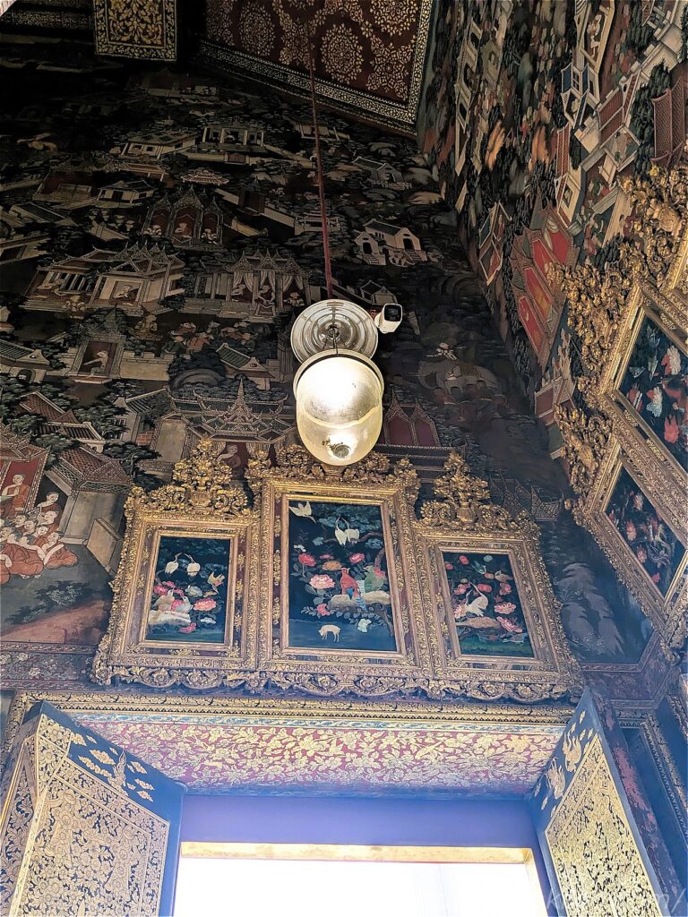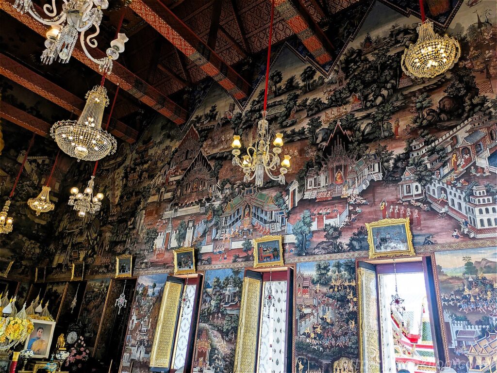 ワット・アルンの本堂は、ラーマ2世の命によって建立。ご本尊の仏様のほか、台座の下にはラーマ2世の遺骨が納められています。荘厳な雰囲気で、壁画には釈迦の生涯が描かれているそう。