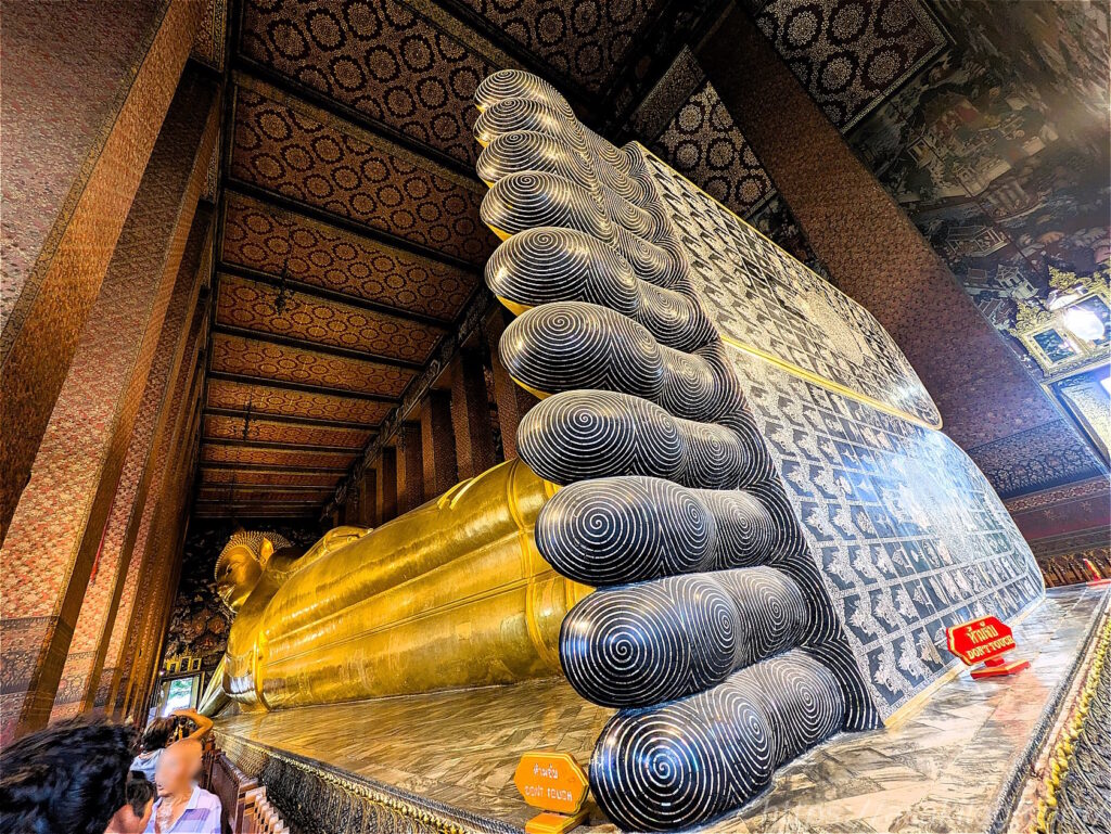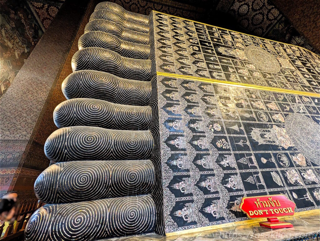 巨大な寝釈迦仏の足の裏も必見。高さ5m幅1.5mもの巨大でぺったんこの扁平の足裏には、仏教の世界観を現した真珠で飾られた108の図が、美しい螺鈿細工(らでんざいく、貝殻を研磨して模様にはめ込んでいく装飾方法)によって描かれているそう。