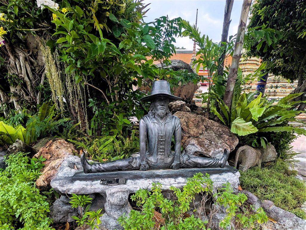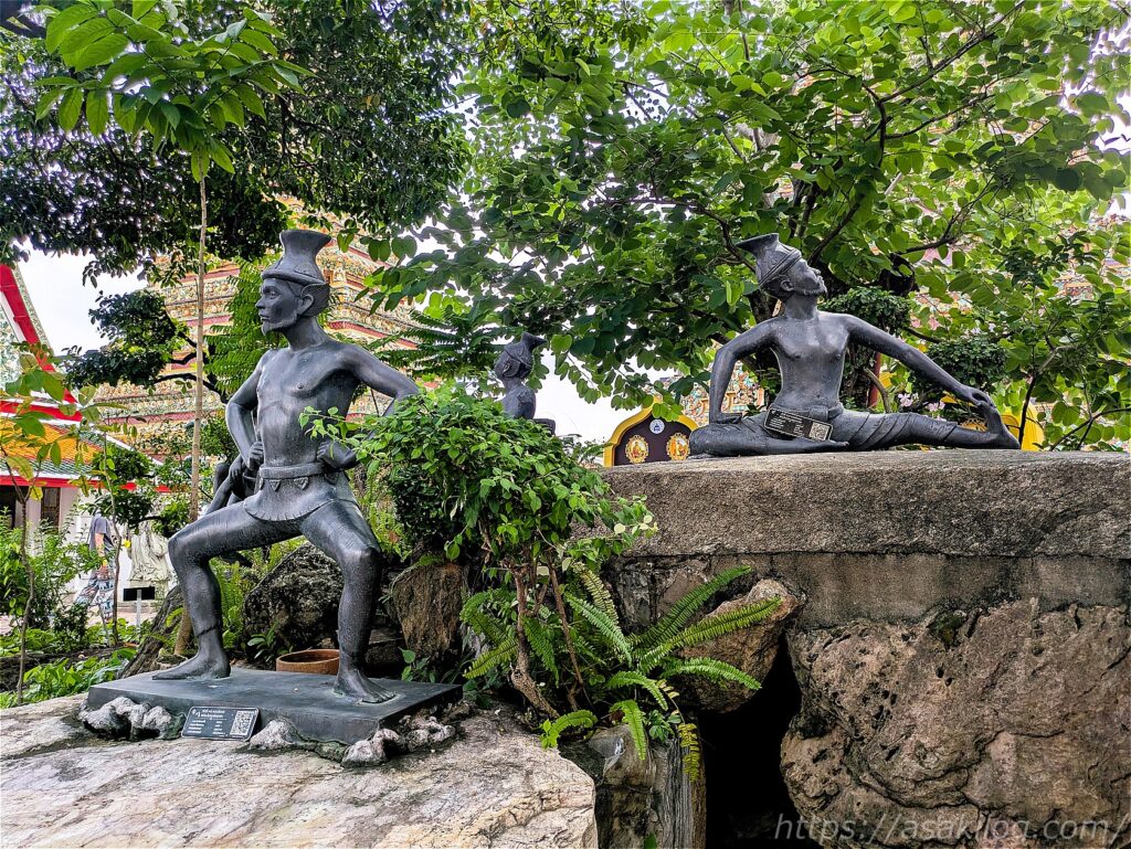 ワット・ポーの境内には、ユニークな石像もたくさんありました。タイ式マッサージの総本山なだけに修行している?像も。なお境内の東屋ではマッサージを受けることもできるようですよ(時間が無かったため体験していませんが)。