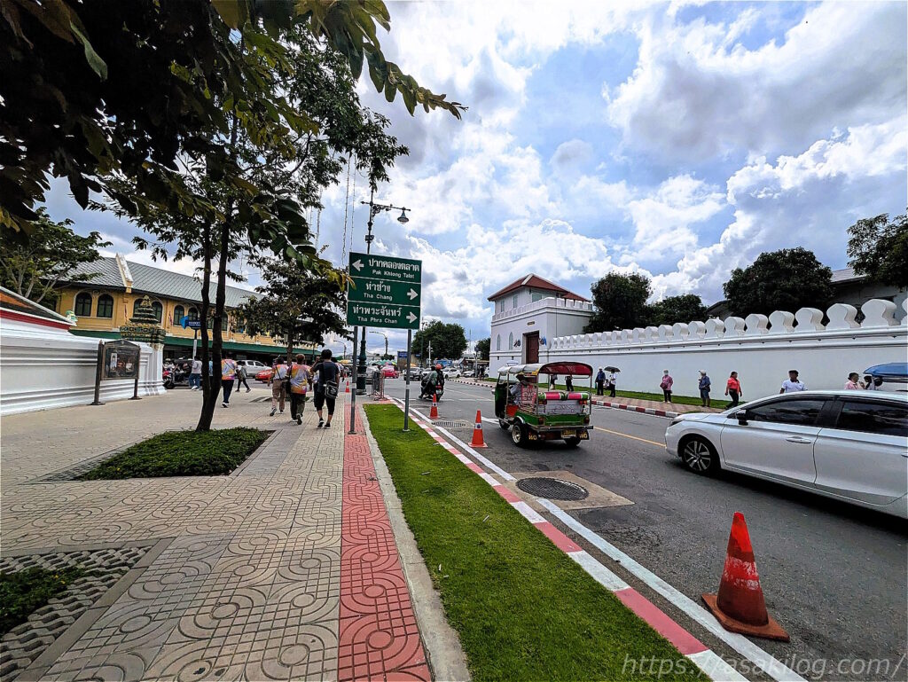 サナムチャイ駅から、ワット・プラケオに向かう道。炎天下の中を、ひたすらまっすぐ歩きます。