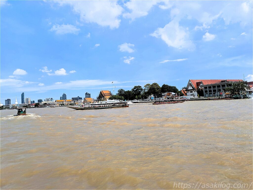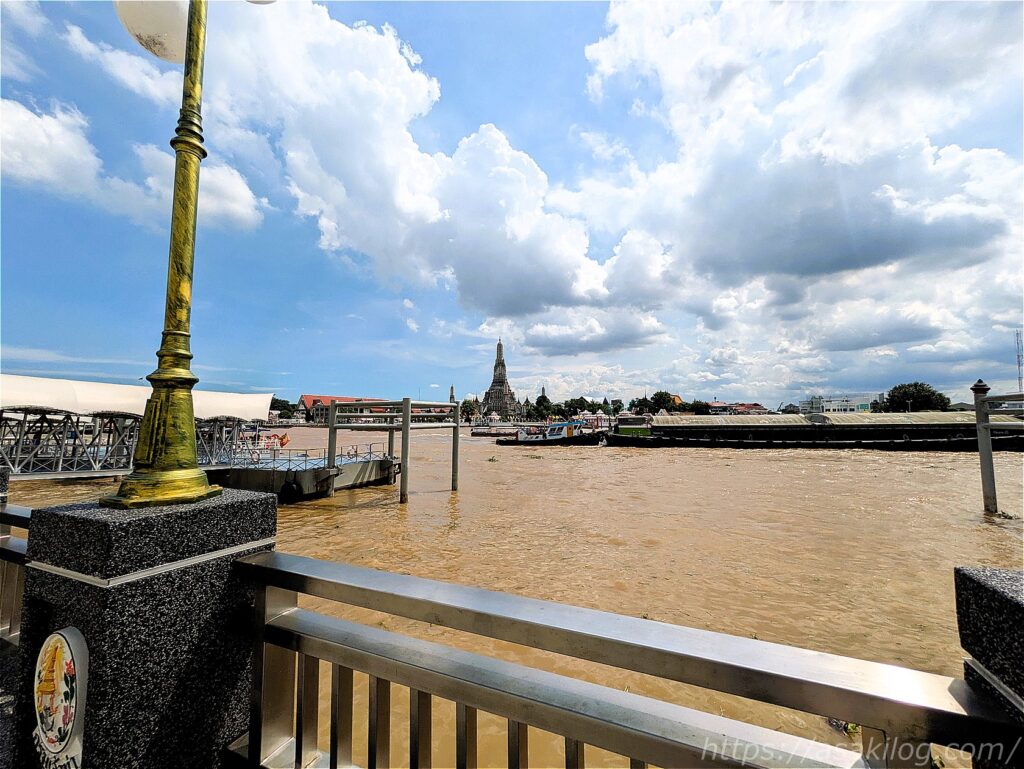 チャオプラヤー川の向こうに、小さくワット・アルンが見えています!