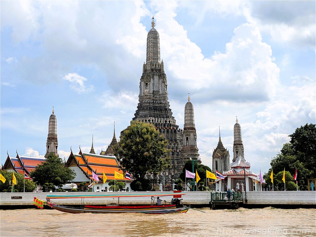 ワット・アルンの「アルン=暁」を意味し、明け方に朝日を浴びるとこの塔が幻想的に輝くことから「暁の寺」とよばれているそう。三島由紀夫が書いた小説のタイトルにもなっています。