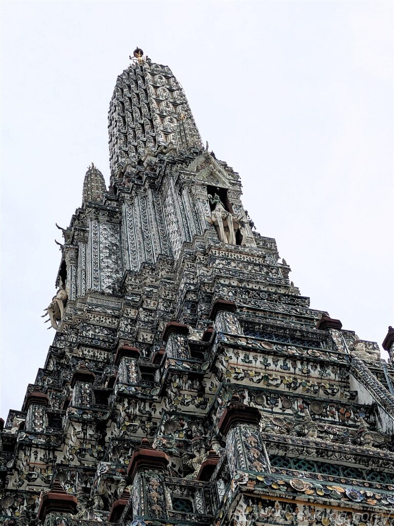ワット・アルンの中央の特大仏塔は高さ75m・台座の周囲が234m。その周囲には4基の小仏塔もあります。大仏塔・小仏塔ともに、表面に陶器の破片で施された装飾が強い日差しを受けるとキラキラ輝くそう。