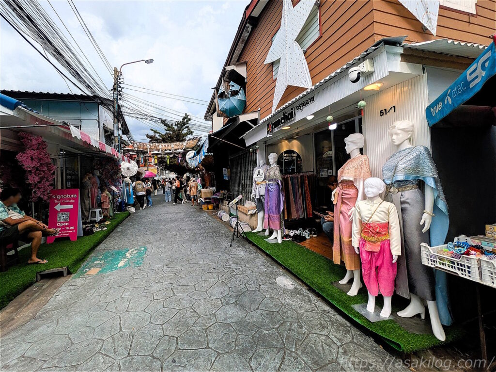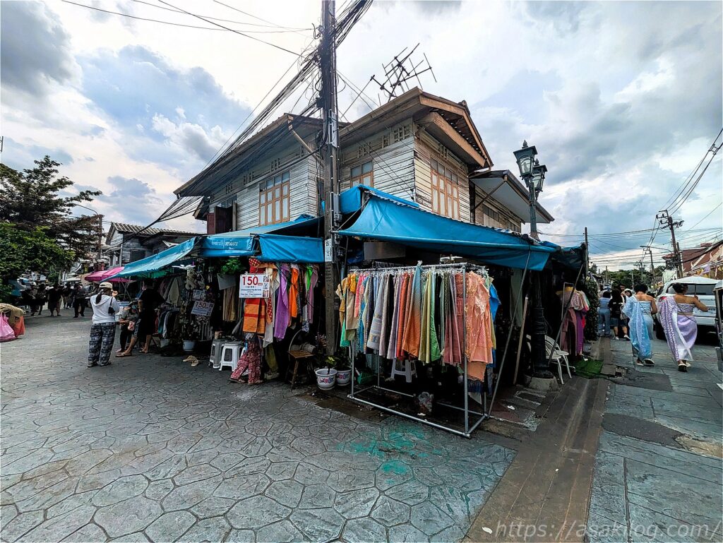 ワット・アルンに入場時とは反対側の出口から出ました。通りにはたくさんのタイ衣装の衣装屋さんがずらり!皆さんここでレンタルしていたのですねー(チャオプラヤー川沿いにはレンタル屋さんが見当たりませんでした)。