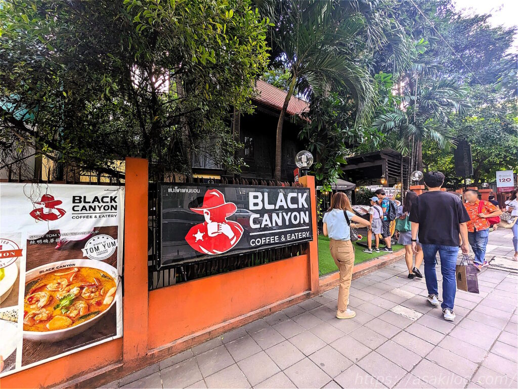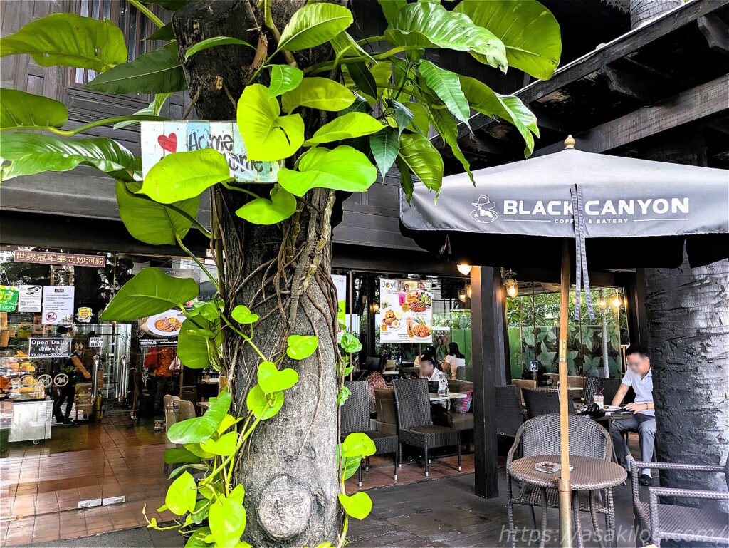 朝、ショッピングに行く前に、まずは腹ごしらえ。そろそろコーヒーやパンが恋しくなってきたので、ホテル目の前の大通り・反対側にある「Black Canyon Coffee Asoke」を利用しました。入口には緑がたっぷり。素敵な癒し空間のカフェです。