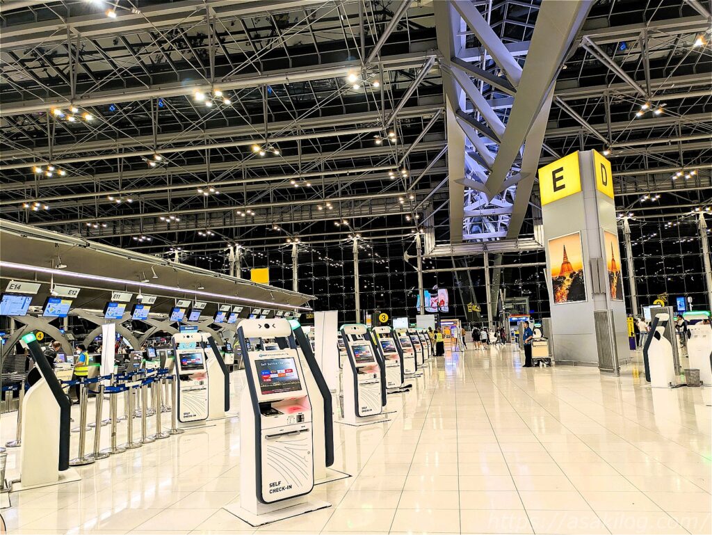 すでにスマホでwebチェックイン済でしたが、カウンターでスーツケースを預ける必要があるため、しばし待ち時間。ウロウロ散策すると、自動チェックイン機がずらりと並んでいました。