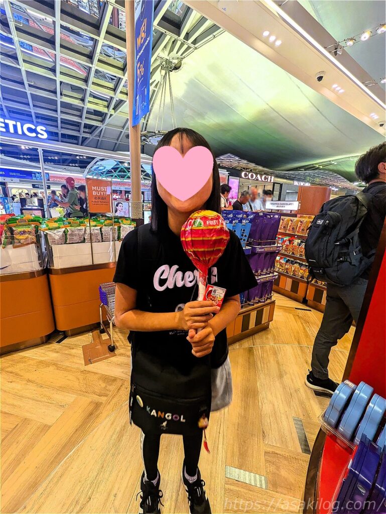 ようやくスーツケースを預けられる時間になったため、重たいスーツケースを娘に運んでもらってAiaAsiaのカウンターへ移動。その後出国手続きをして、免税店などを散策。チュッパチャップス大き過ぎじゃない?
