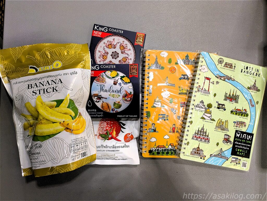 その後の搭乗待ち時間も暇だったので、ホットチョコラテ(160THB)を飲んだり、ターミナル21+免税店で購入したお土産(ノート+コースター=190THB、ドライいちご30THB、バナナスティック175THBなど)を撮影して過ごすなど。