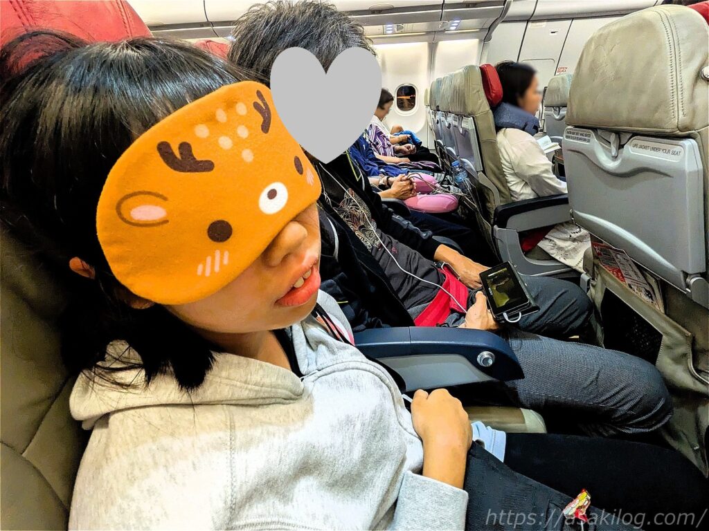 ようやく機内に搭乗できました。娘、すぐアイマスク装着→即寝です(このアイマスクは、修学旅行の宮島で購入したもの。鹿が可愛くてお気に入り。笑)