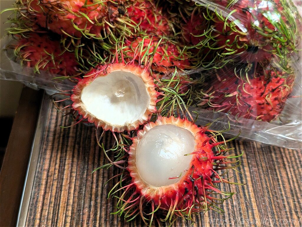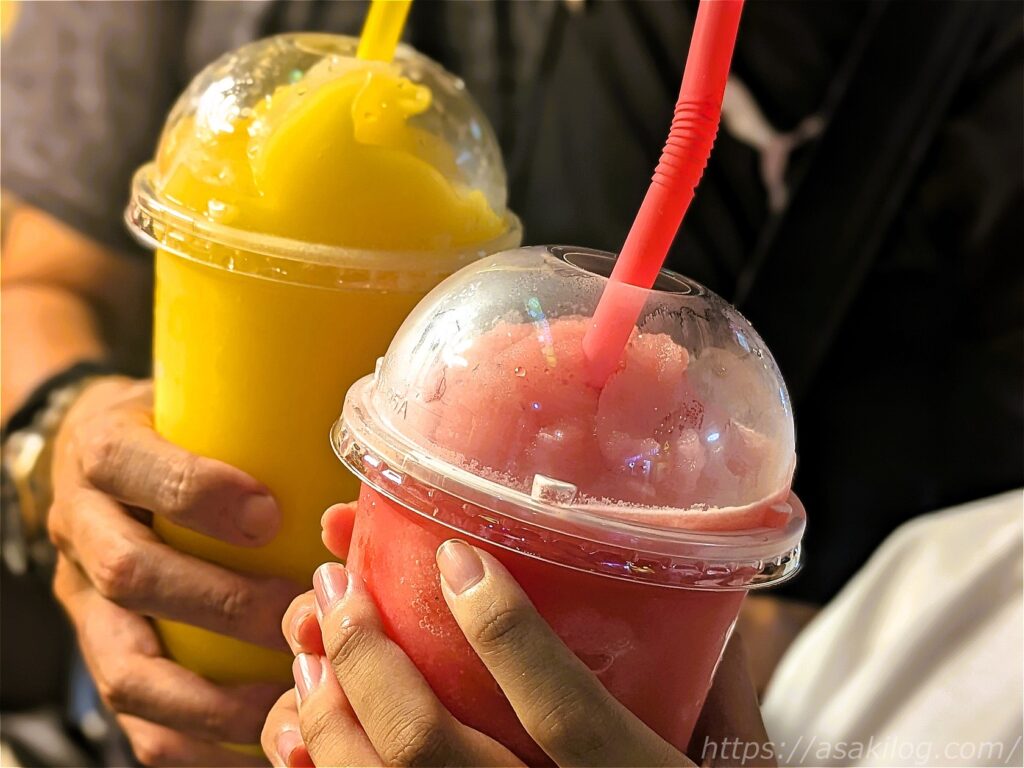 マンゴーとスイカのスムージー、夫が自腹で購入したため金額は分からず。私は屋台のスムージーでお腹を壊すのが怖かったのでパス(ひと口だけ味見しました)。ランブータンを1袋購入(100THB=約420円)、ホテルで食べました。