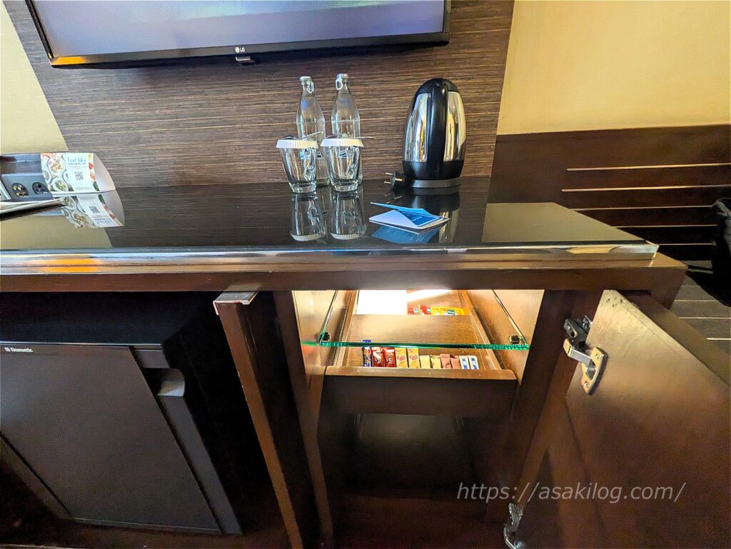デスク、液晶テレビ、ミニ冷蔵庫(中身は空)があります。