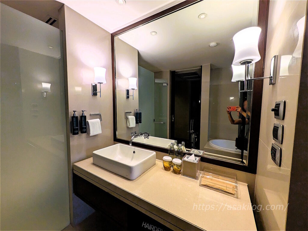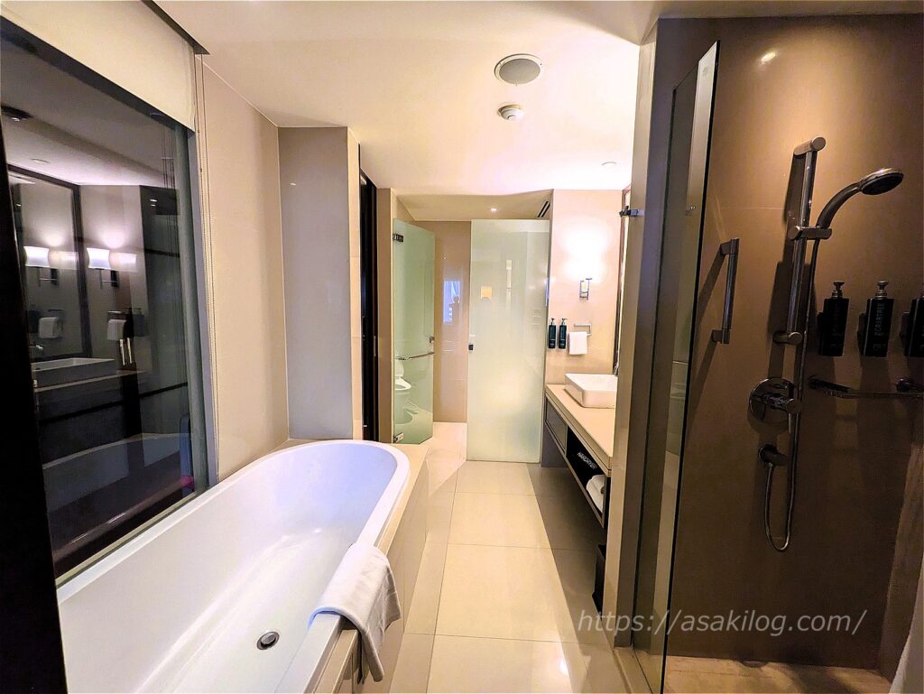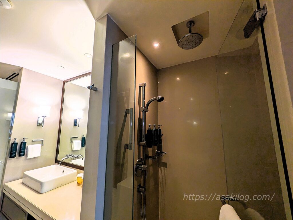 シャワールームはガラスで囲まれた独立スペース。天井に固定されたオーバーヘッドシャワーと、高さの調節や取り外して使えるハンドシャワーもあり、水圧は問題ありませんでした。
