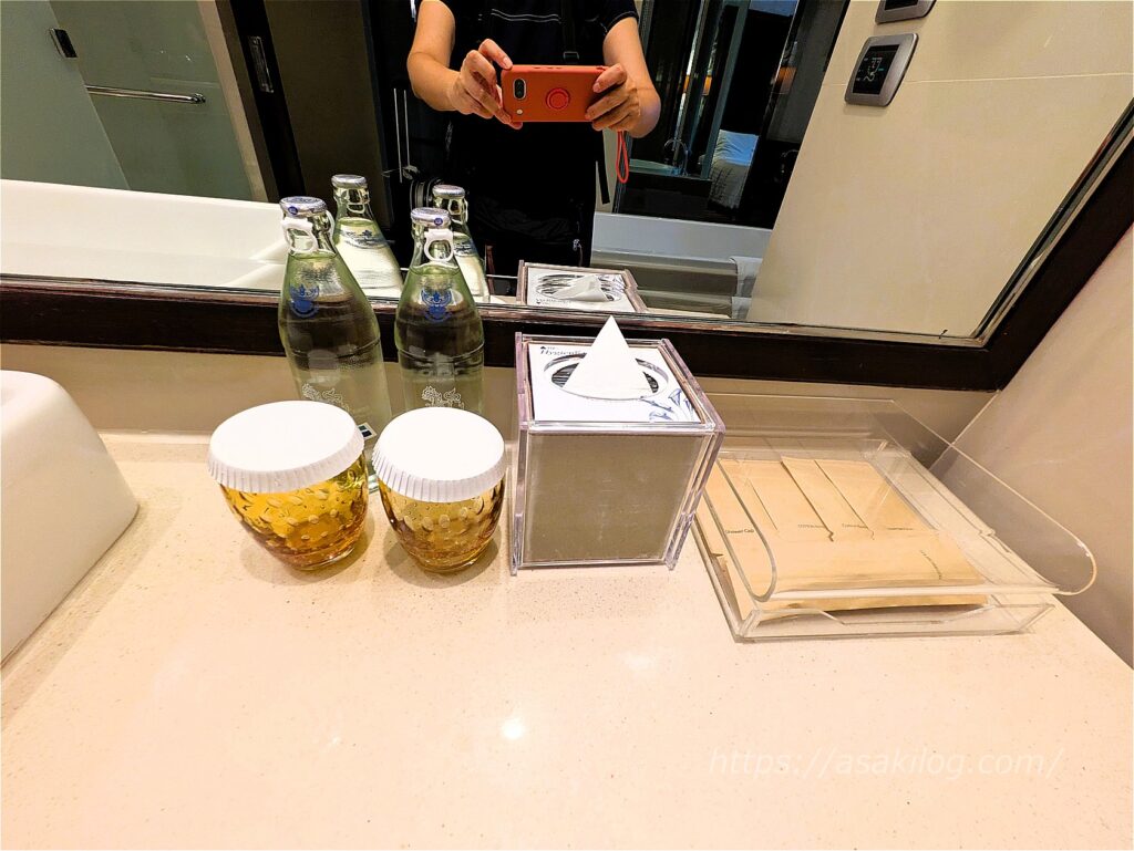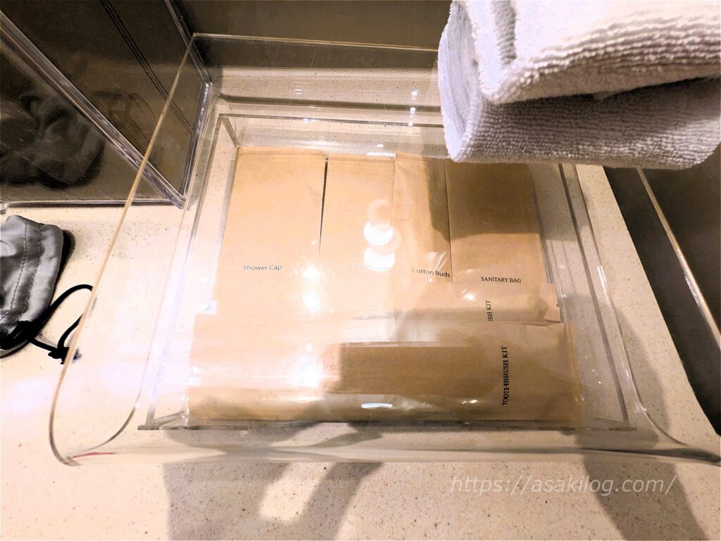洗面台の左側には、ハンドソープとボディローション(こちらもクラブツリー&イヴリンのもの)。飲料水、ティッシュなど。透明のクリアケースには細かいアメニティ類がまとめて入っていました(歯ブラシキット、シャワーキャップ、綿棒など)。