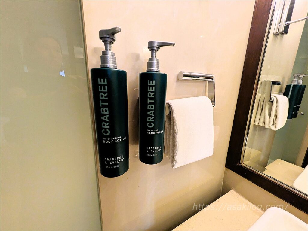 シャワールームには、ヒルトンホテルのアメニティに使われている人気ブランド「クラブツリー&イヴリン(CRABTREE & EVELYN)」のシャンプー・コンディショナー・ボディーソープを備え付け。とてもよい香りでした~。
