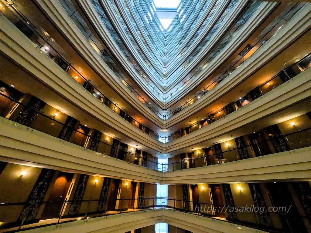 客室の廊下側に、大きな吹き抜けがありました。2枚目の写真が今回滞在したお部屋。