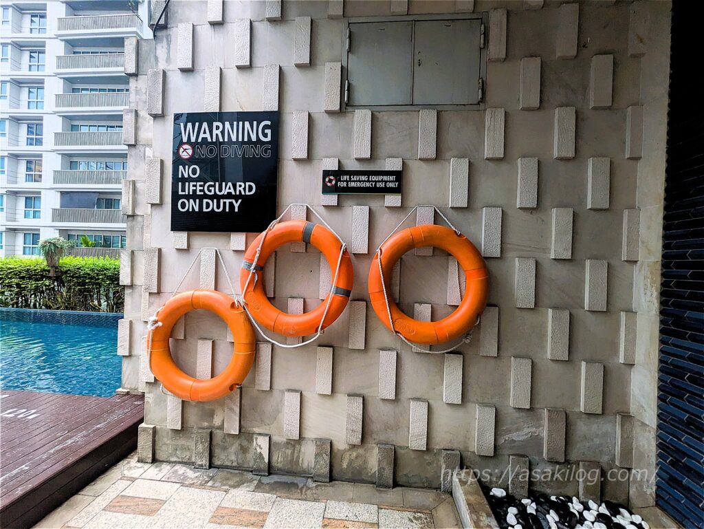 プール入口にあるタオルは自由に使えます。ライフガードは不在、緊急時に使う救命用具として浮き輪がありました。