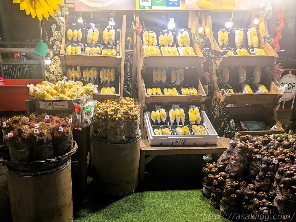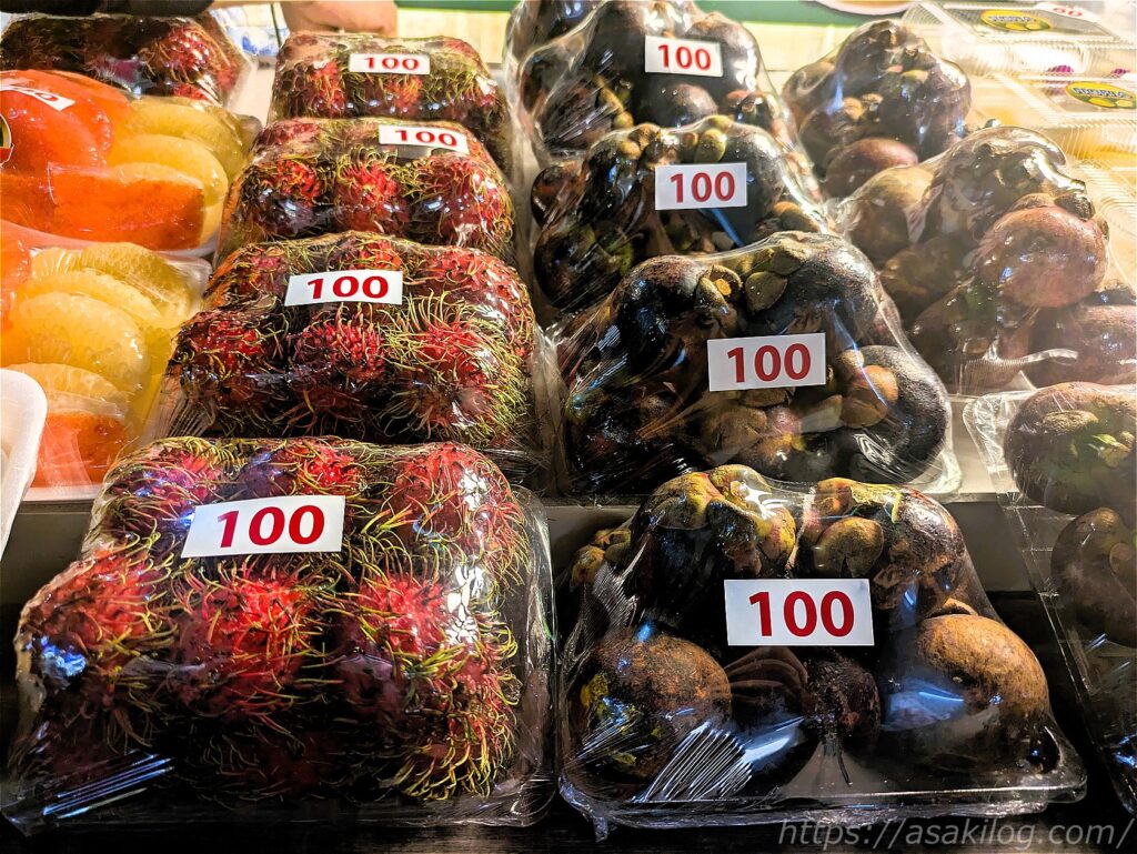 フルーツ屋さんには、たくさんの果物が並んでいます。ランブータン、マンゴスチン、パイナップル、奥の密封されている黄色いフルーツは多分ドリアンかな。