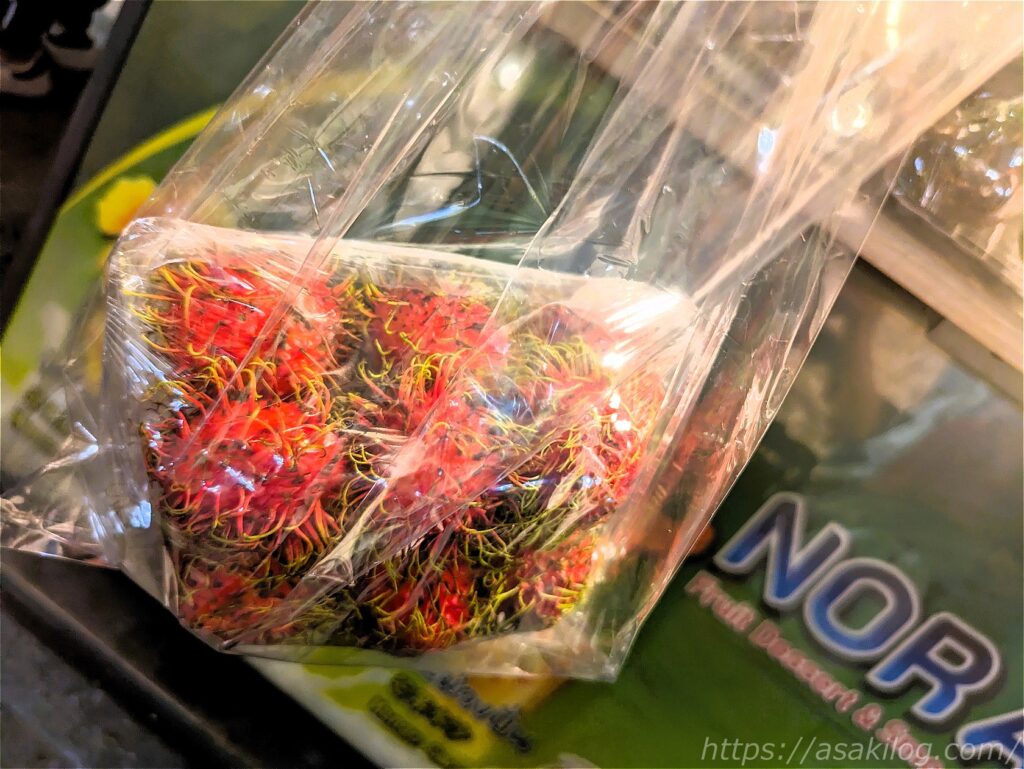 スーパーで買った方が確実に安いのは分かっていたけど、その日の夜にホテルで食べたくてついつい購入。ランブータン1袋100THB(約420円)でした。