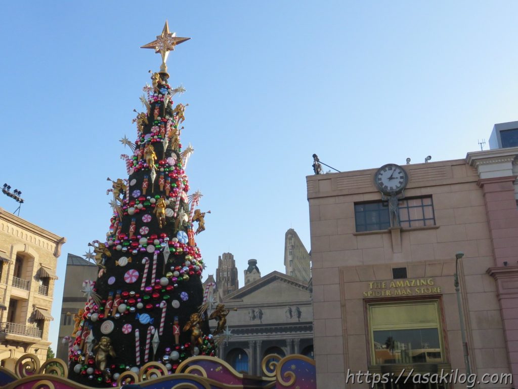 USJのクリスマスツリーは、ニューヨーク・エリアのターミネーターとスパイダーマンの間あたりにあります。