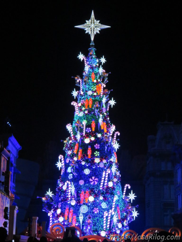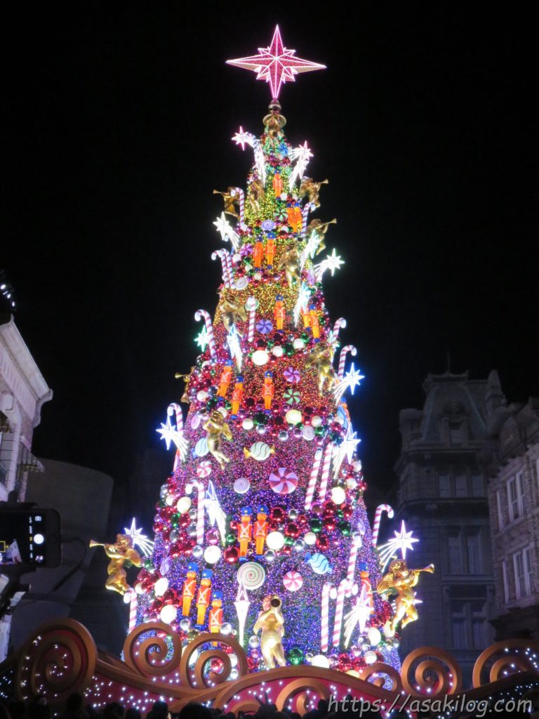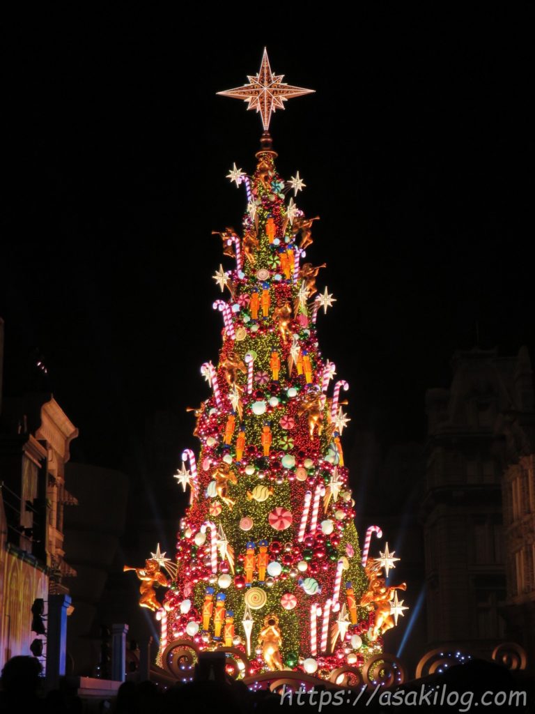 夜のクリスマスツリーは「天使のくれた奇跡Ⅲ」ショーの中で点灯します。ショー終了後は、ずっと点灯しているから、見放題!