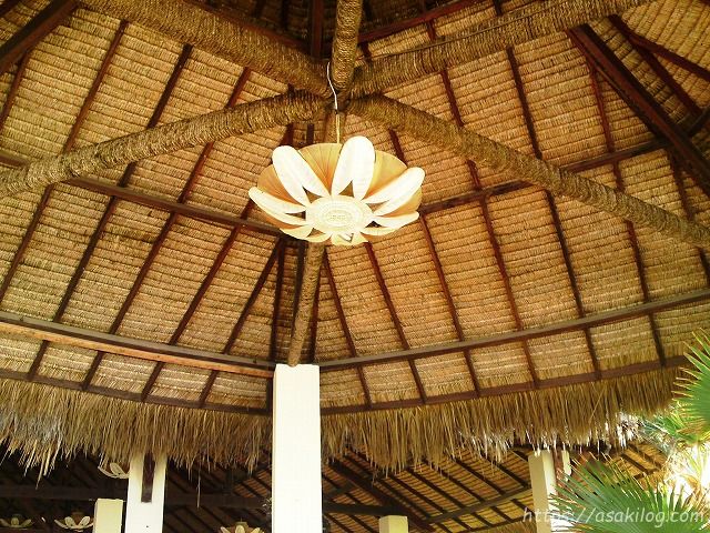 ホテルの食堂の屋根を見上げると、こんな感じ。ザ・南国って感じ。