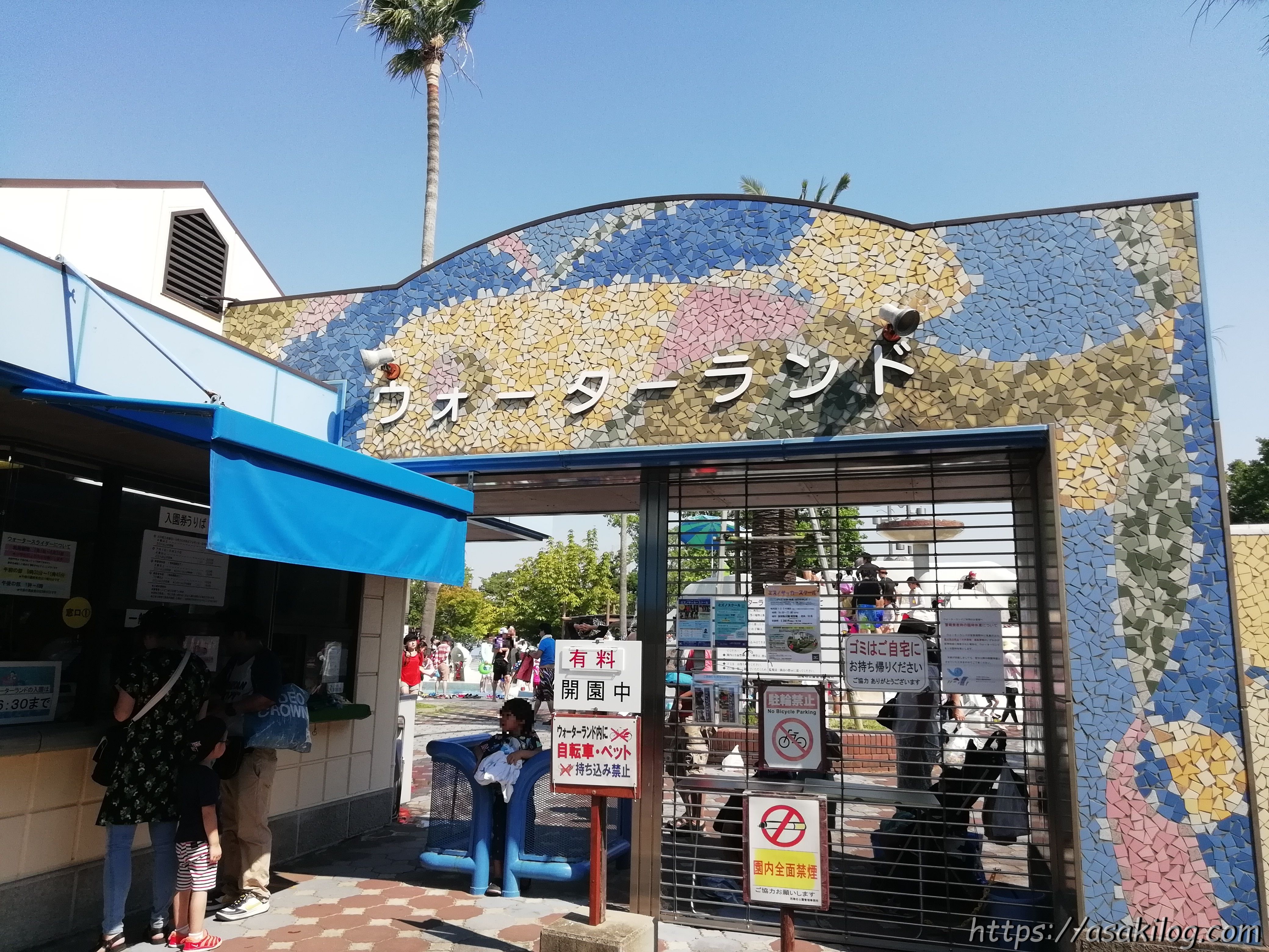 ウォーターランドの入口に到着。ウォーターランドの入園料は、時期によって異なります。7月1日~8月31日は「4歳~69歳まで300円」。家族3人分だから900円支払いました。安いのが嬉しい!