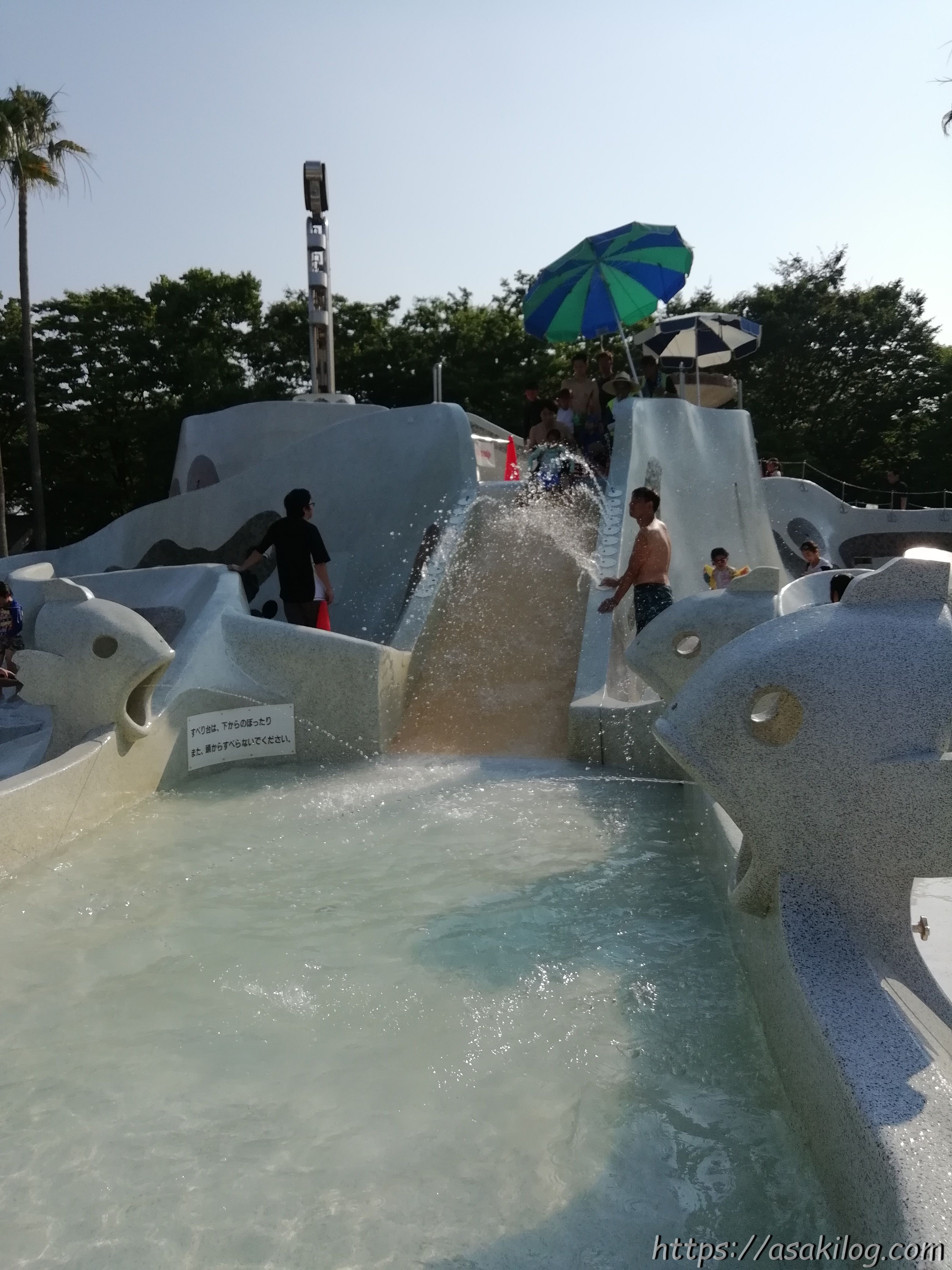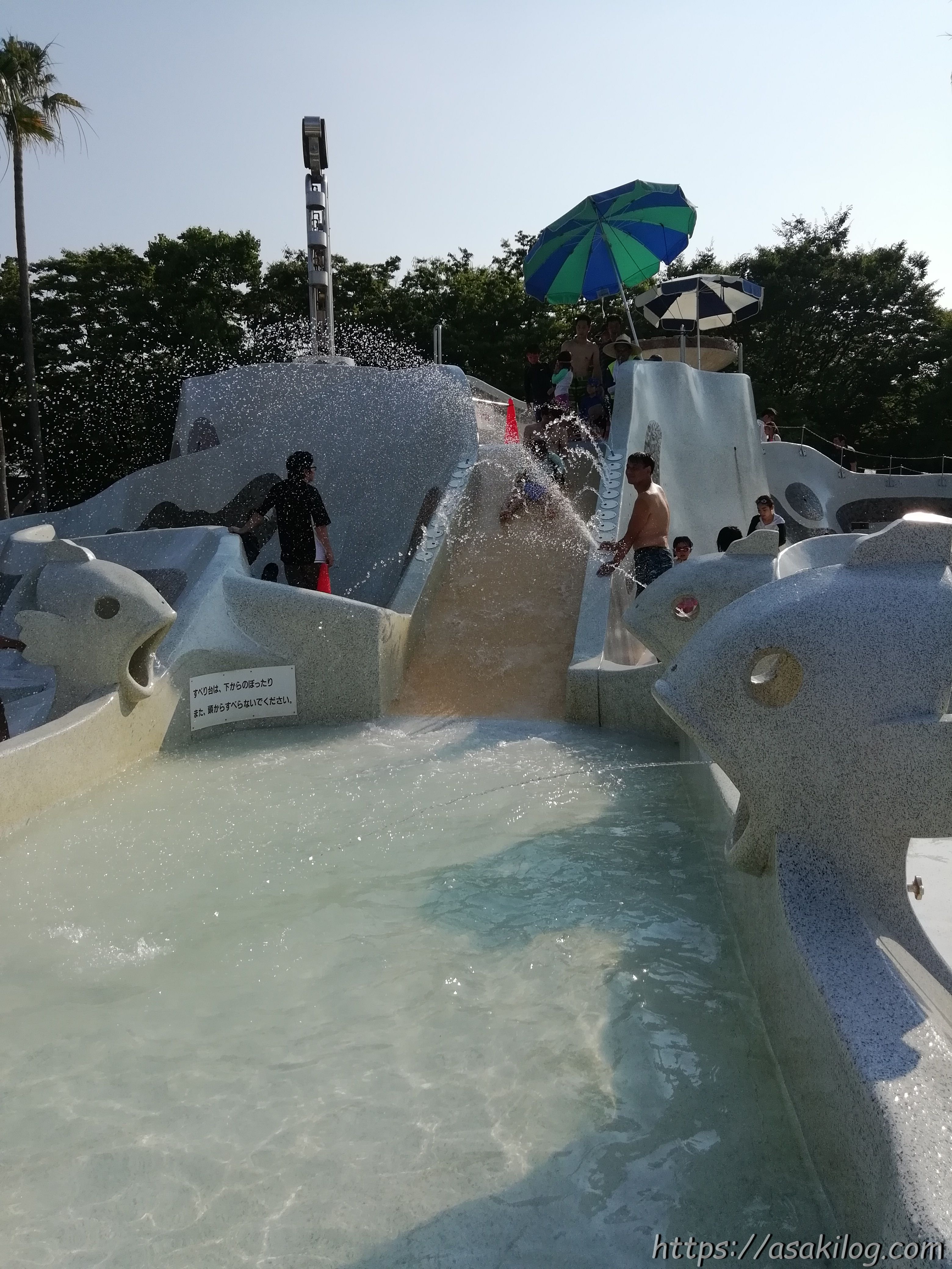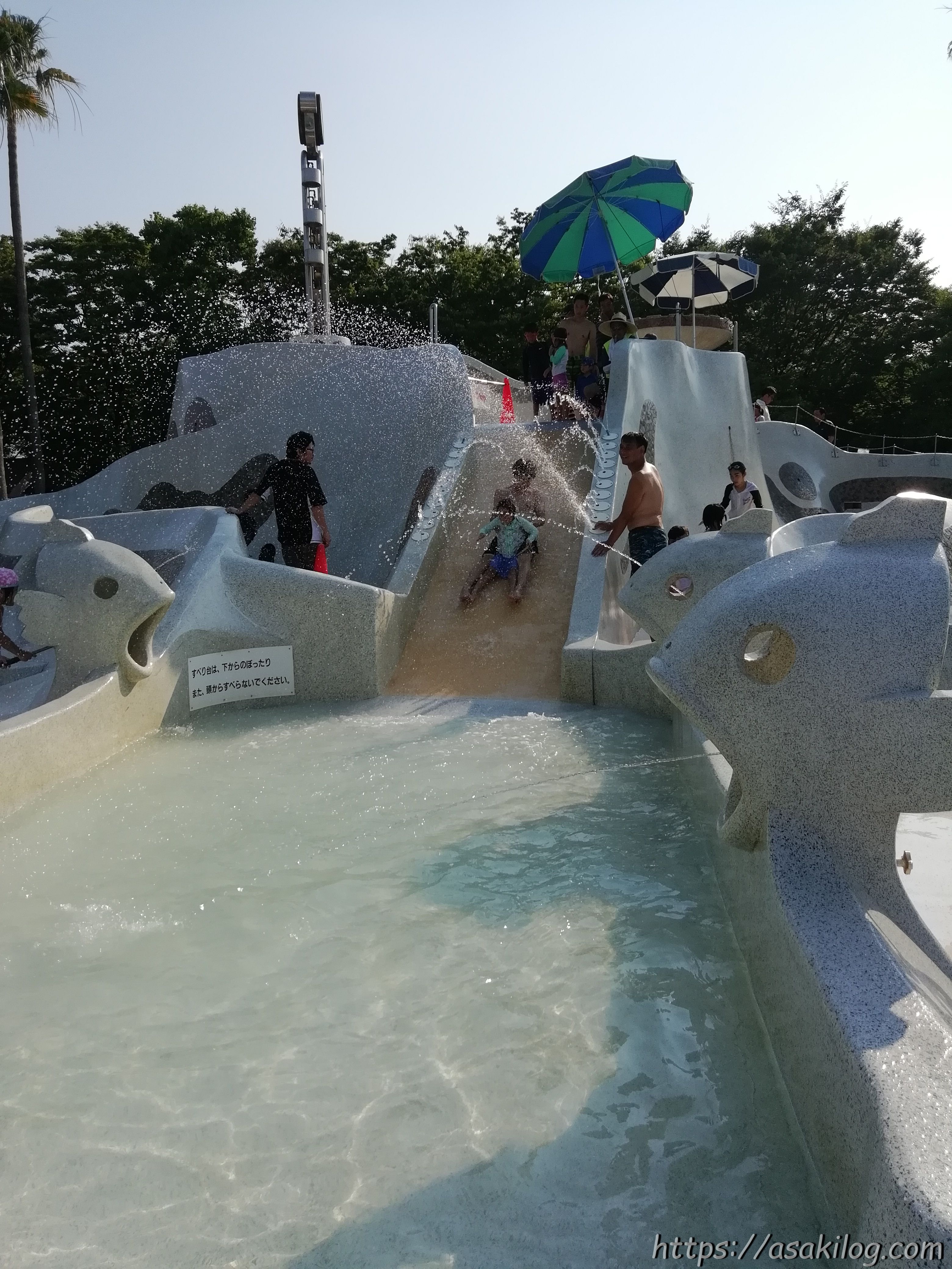 ちなみに滑り落ちるプール部分左右にあるお魚のオブジェ(?)からは、子どもたちが水鉄砲のようにして狙った方向に水が飛んでいきます。すべり台を滑る人を狙ったり・・・?(笑)
