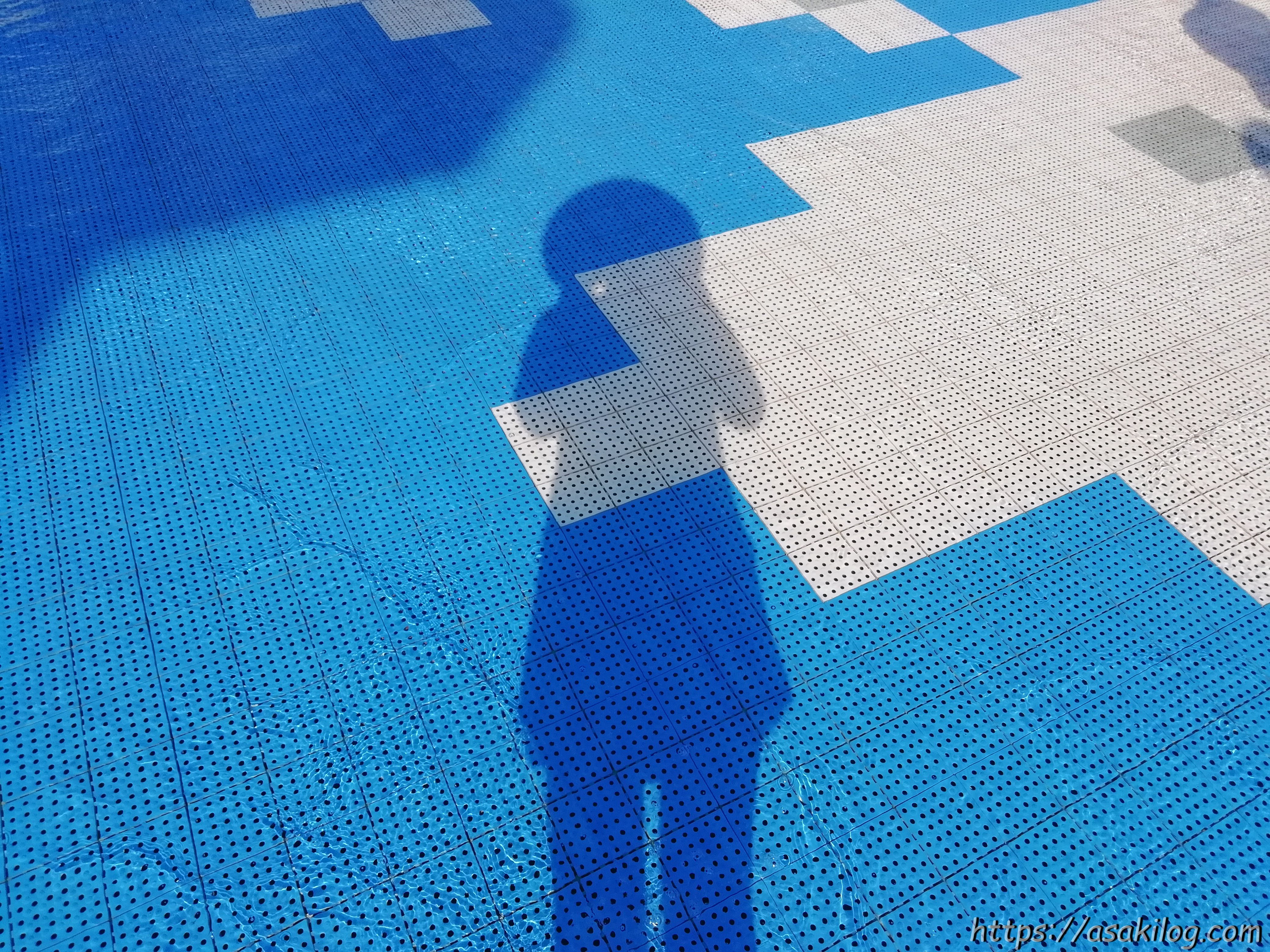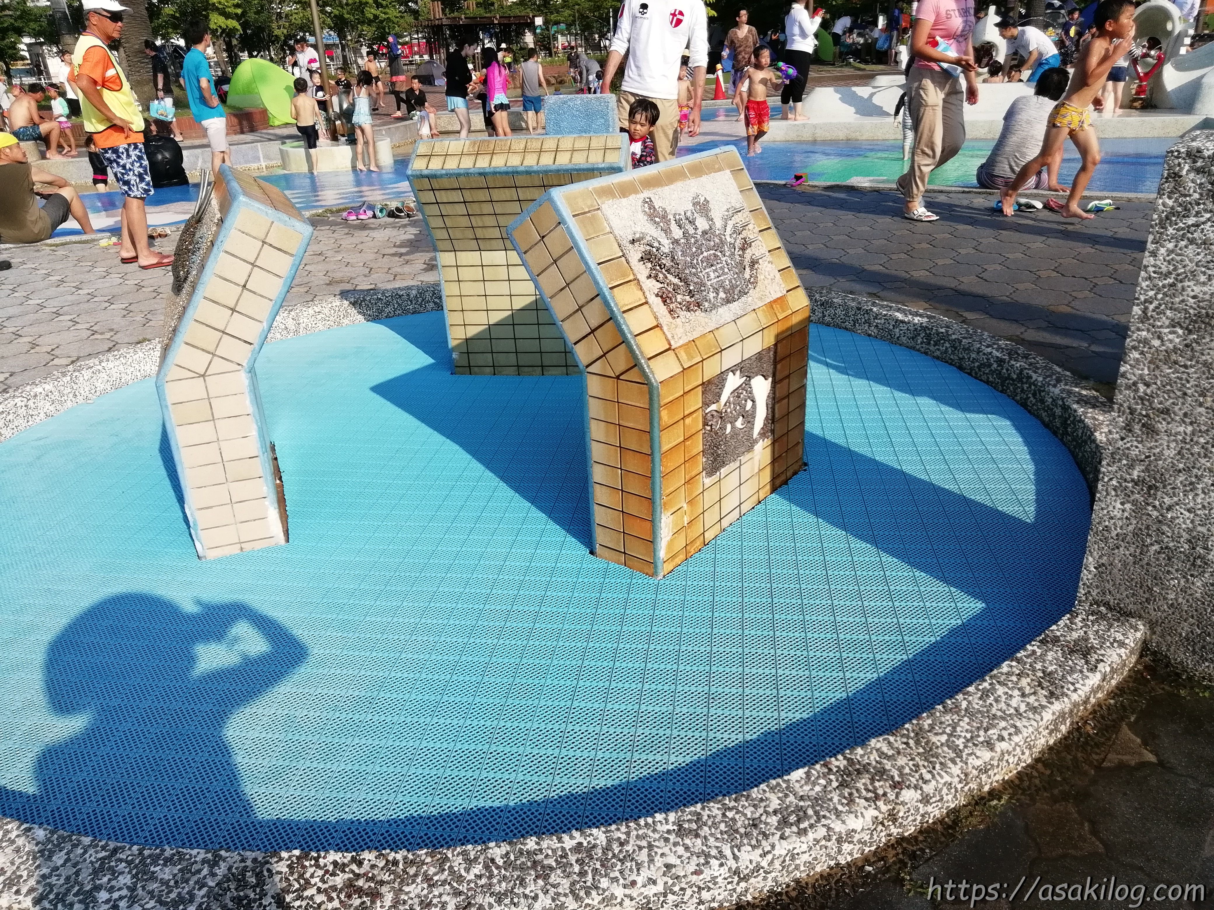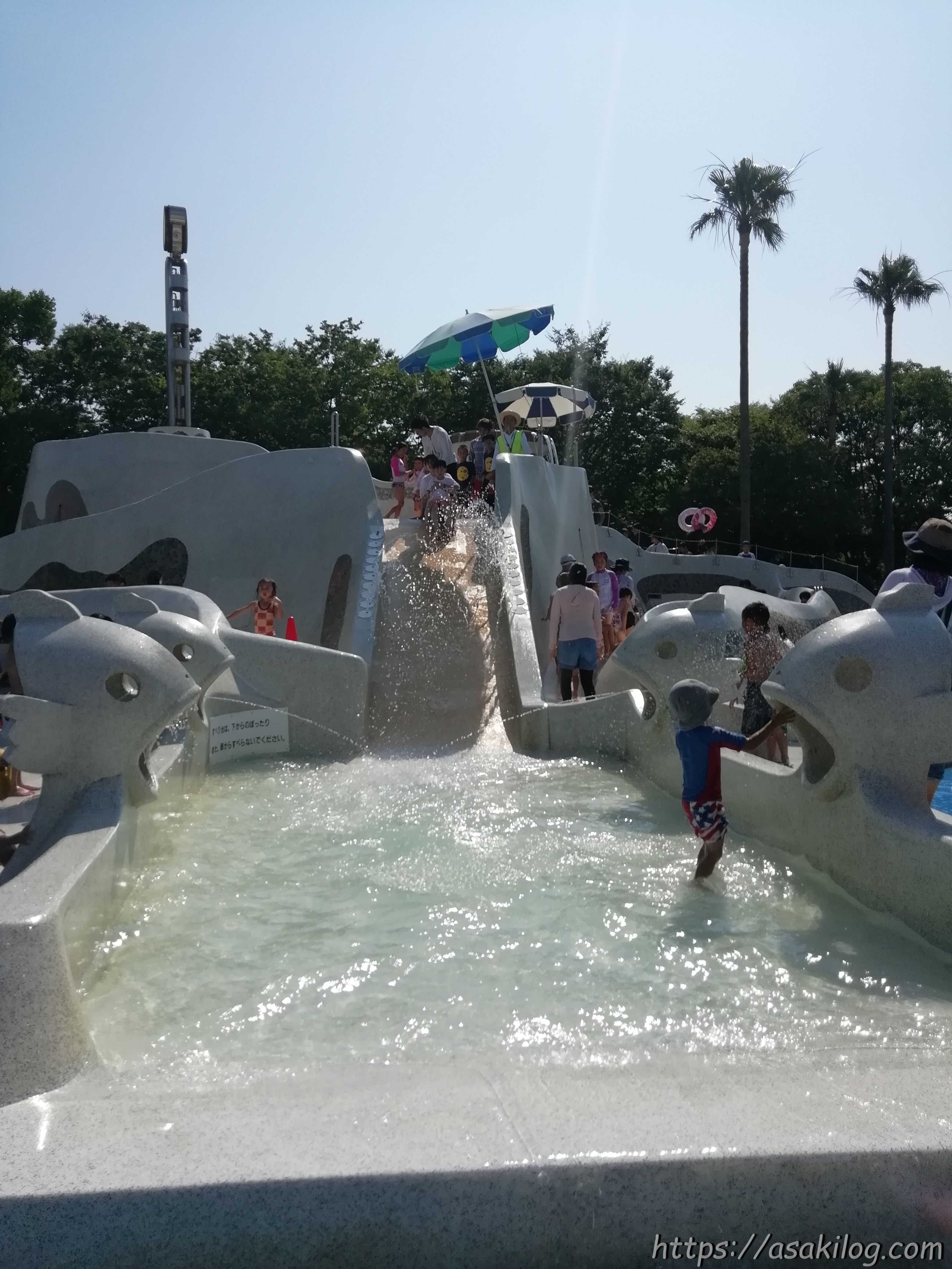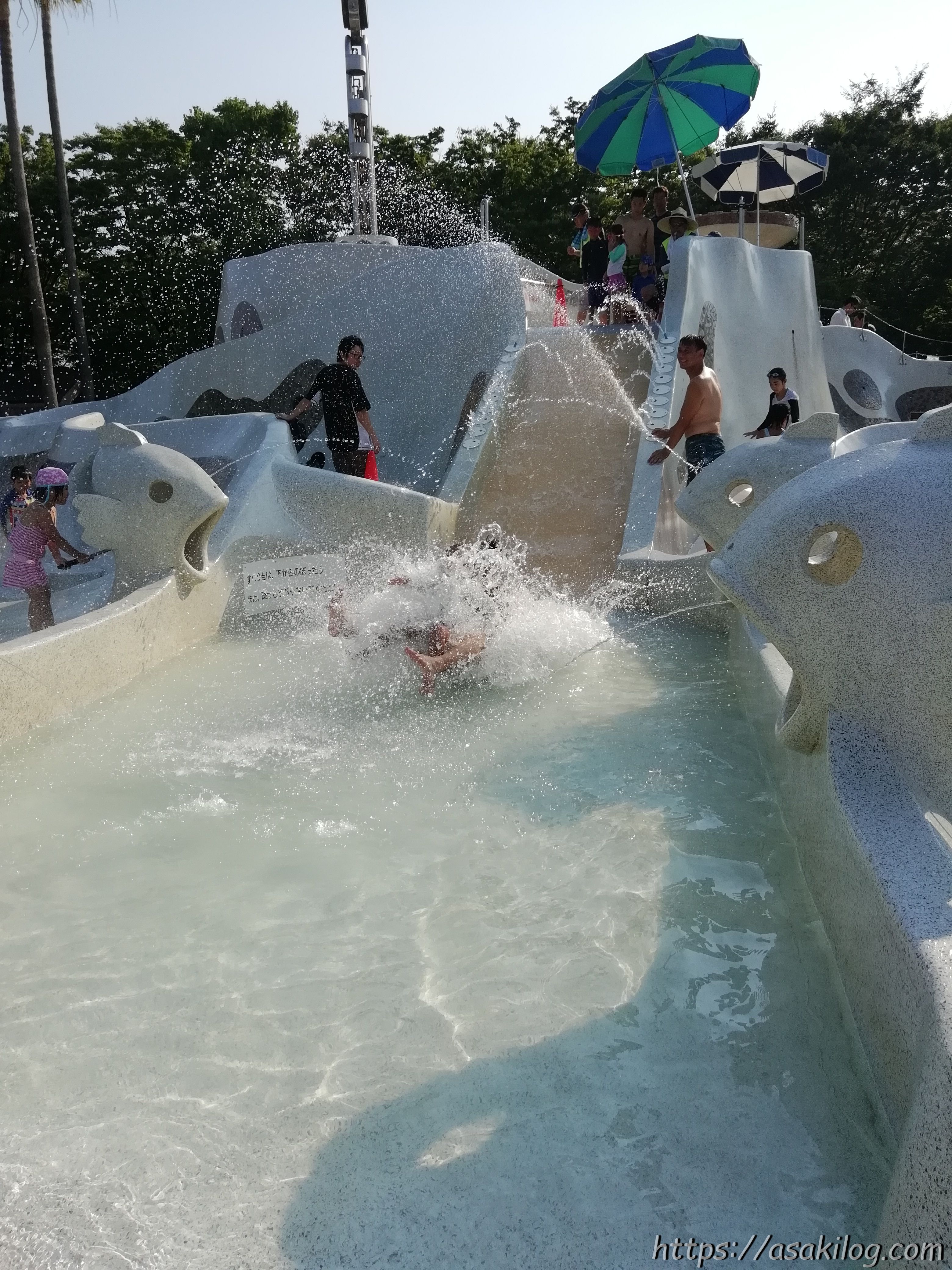 ちなみに滑り落ちるプール部分左右にあるお魚のオブジェ(?)からは、子どもたちが水鉄砲のようにして狙った方向に水が飛んでいきます。すべり台を滑る人を狙ったり・・・?(笑)