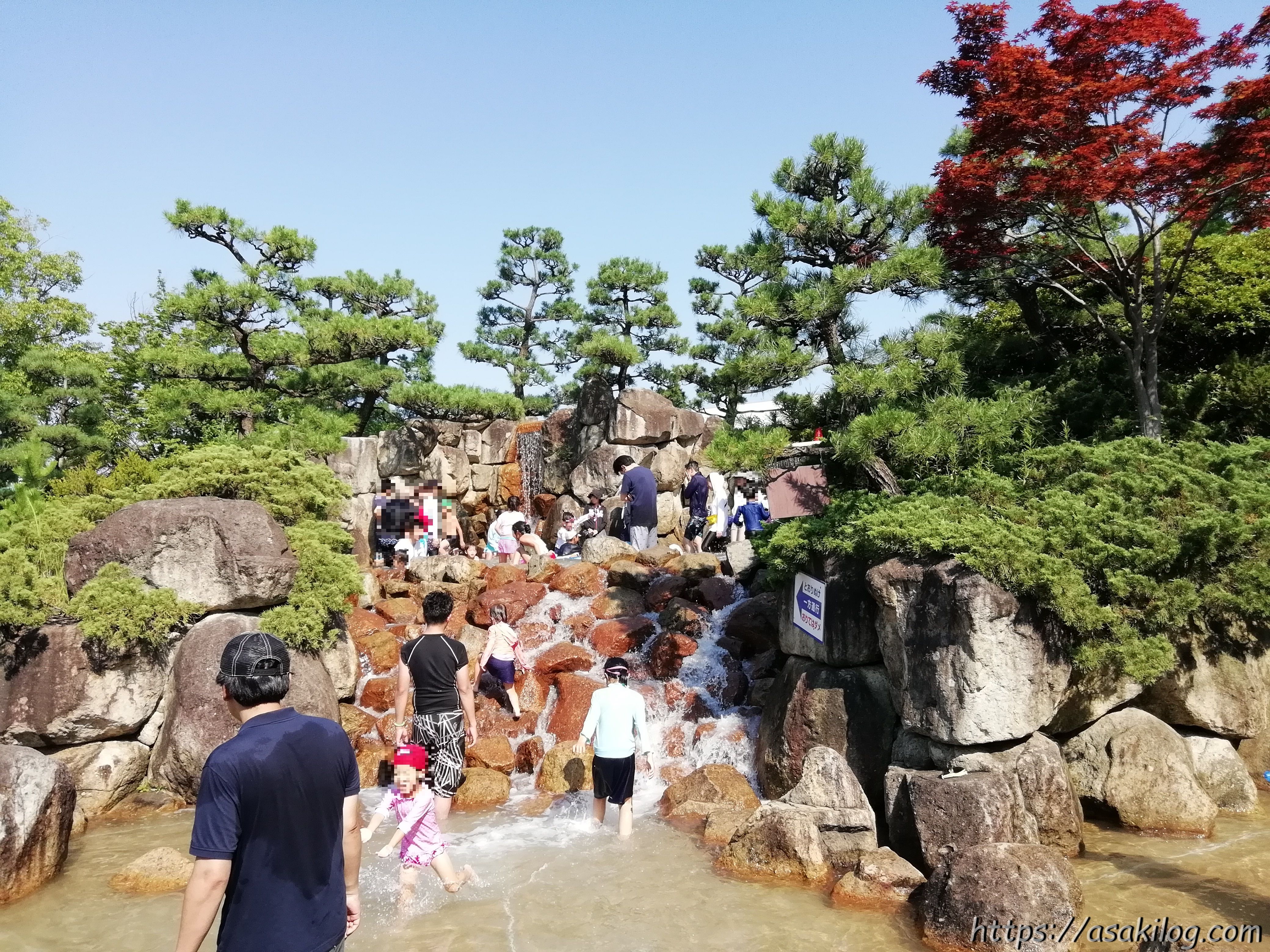 岩を降りてから、ウォーターランド入口に向かう途中にあるのが、流れゾーン。ここは浅い川が流れていて、日陰もたくさんあります。小さなお子さんをピチャピチャ遊ばせるのにおすすめ!(浮輪は、全く役に立ちません~)